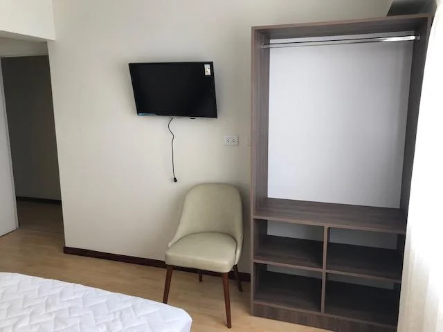 Principal: Cama matrimonial, TV de 40”, dos mesas de noche y amplio clóset.