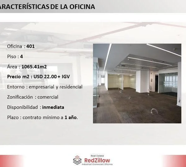 TIPO Amplia oficina de m modernamente implementada en el piso del edificio Torre Begonias ubicada en la zona empresarial del distrito de San Isidro UBICACIN Ca Las Begonias en el distrito de San Isidro en zona empresarial y comercial CARACTERSTICAS DE EDIFICIO Sala de Usos Mltiples Sala de Proveedores Aire Acondicionado Grupo Elctrgeno CONTACTAR Celular WhatsApp Igualmente puedes comunicarte para revisar nuestra disponibilidad de locales similares o alternativos que se ajusten a tu necesidad Somos RedZillow especialistas en servicios corporativos abarcando desde la representacin de propietarios y arrendatarios hasta el financiamiento de capital a largo plazo Nuestra meta es ayudarte a fortalecer y enriquecer la inversin en tu negocio ocupndonos de soportar tus decisiones inmobiliarias sobre espacios de oficinas almacenes retail terrenos y plantas industrialesSomos RedZillow especialistas en servicios corporativos inmobiliarios con alto compromiso y experiencia en la representacin de propietarios compradores y arrendatarios Nuestra meta es ayudarte a encontrar el mejor espacio para negocio o actividad comercial ocupndonos de soportar tus decisiones inmobiliarias relacionadas a espacios de almacenes plantas industriales locales comerciales oficinas y terrenos