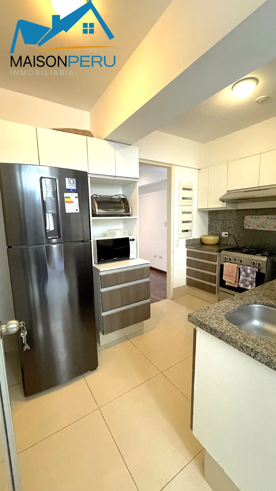 Cuenta con un hall de ingreso que conduce a una elegante sala comedor con balcón y hermosa vista a la ciudad y piscina, baño de visita, cocina completamente equipada, lavandería con lavaseca, dormitorio de servicio con baño completo. Terma 80 litros