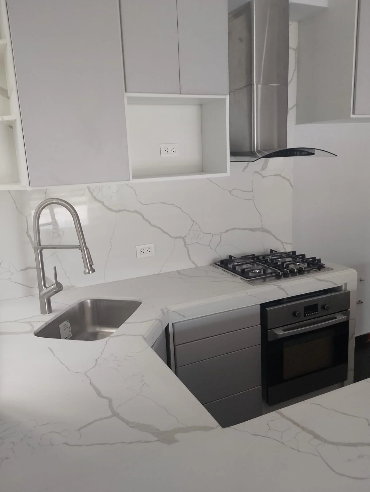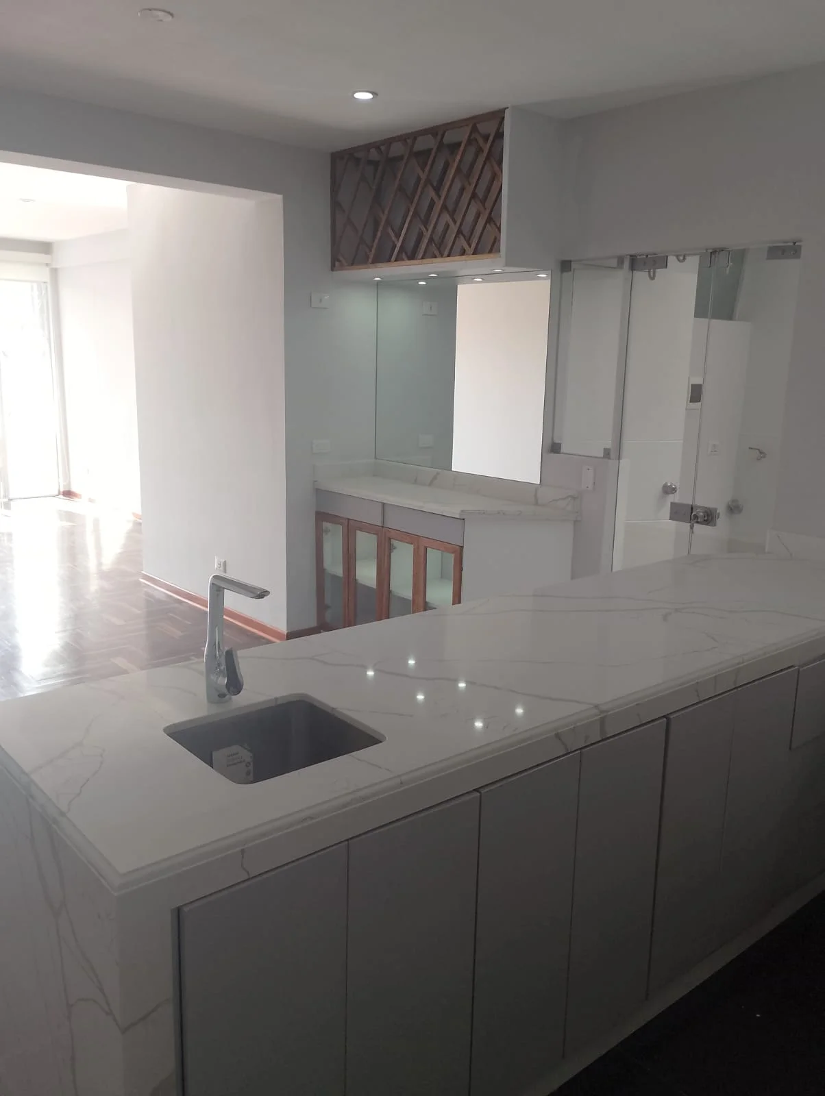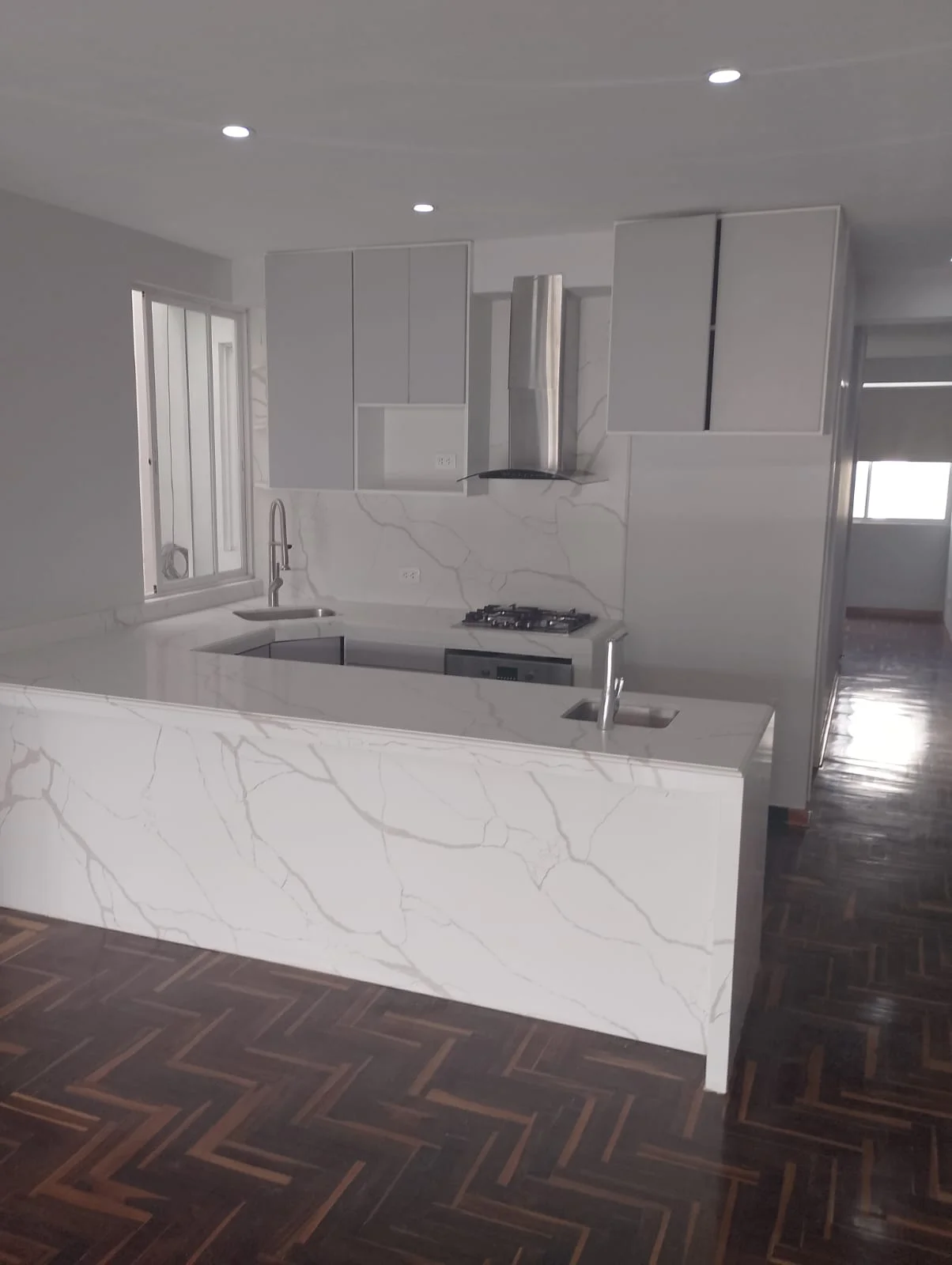 Cocina abierta con barra de granito, reposteros altos y bajos, cocina Bosh empotrada.