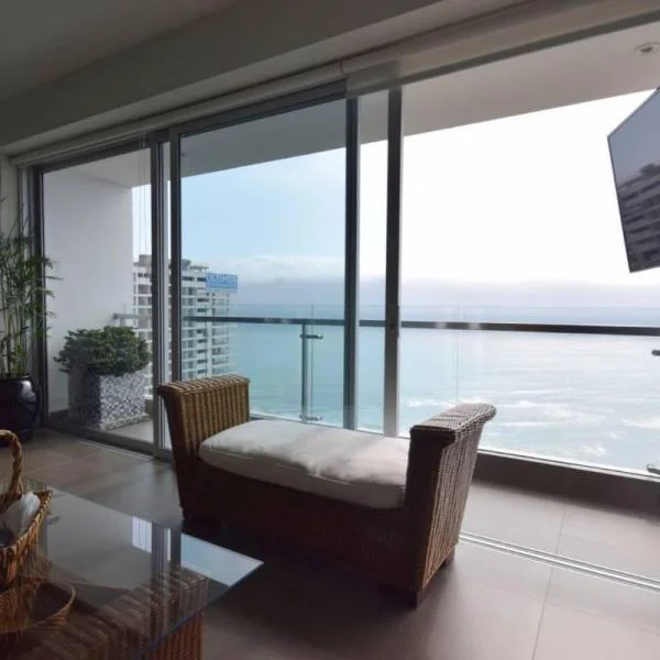 (Cod. MIAR017) Excelente departamento flat en alquiler, sin muebles, ubicado en la cuadra 1 del Malecón de la Marina, frente al parque Grau y al Malecón Cisneros, con hermosa vista panorámica al mar. Cuenta con hall de ingreso, amplia sala comedor con pisos de mármol y chimenea, conectado a amplio balcón y terraza equipada con bar y kitchenette, baño de visitas, 3 dormitorios con baño incorporado y walk in closet (principal con jacuzzi y ducha, demás baños con ducha) y sala de estar. La cocina es amplia, tiene muebles altos y bajos, comedor de diario, área de servicio y zona de lavandería. La sala comedor, la terraza, el dormitorio principal y el segundo dormitorio tiene vista directa al mar; la sala de estar tiene vista parcial. Ambientes amplios e iluminados. Dos ascensores al dpto.: principal (directo al dpto.) y de servicio (al piso). El precio incluye 2 estacionamientos y 1 depósito. El costo de mantenimiento es de 1450 soles aprox. Se puede alquilar sin muebles o con línea blanca. Áreas comunes: amplios lobby, piscina temperada, gimnasio equipado, SUM, jardín y sala de juegos. El edificio a sido construido en el 2015 y se encuentra en excelentes condiciones. Guardianía las 24 horas. No se aceptan mascotas. Para más información comunicarse al 2 2 2 0 3 0 1