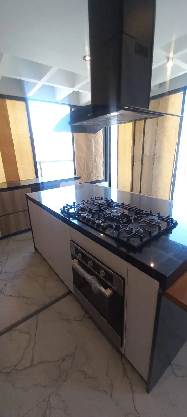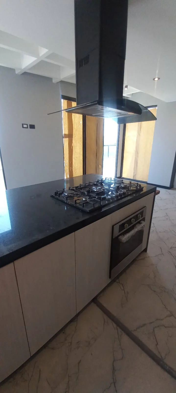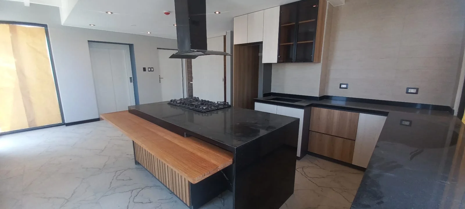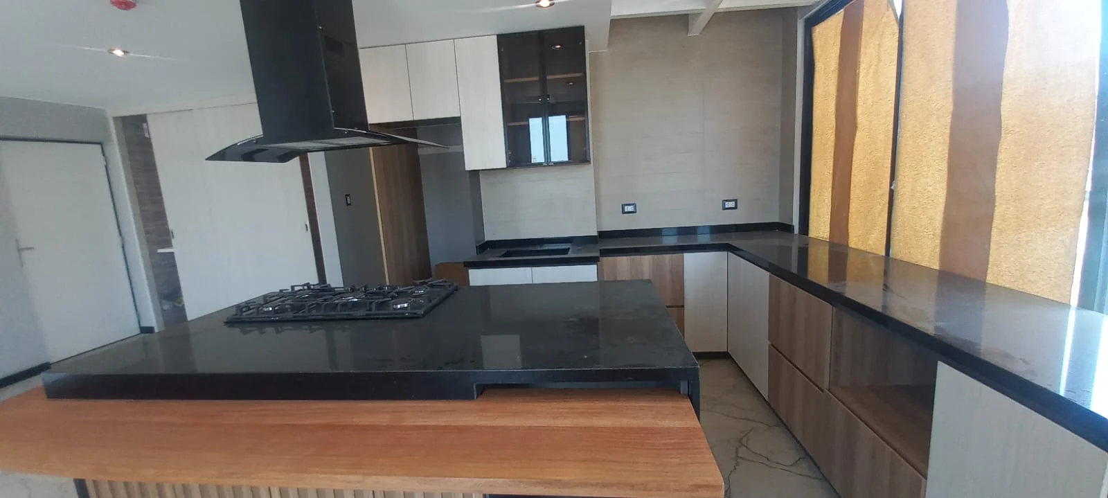 · Cocina abierta tipo americana amoblada con reposteros altos y bajos y equipada con ( Cocina encimera, horno y campana extractora) y mesón de granito