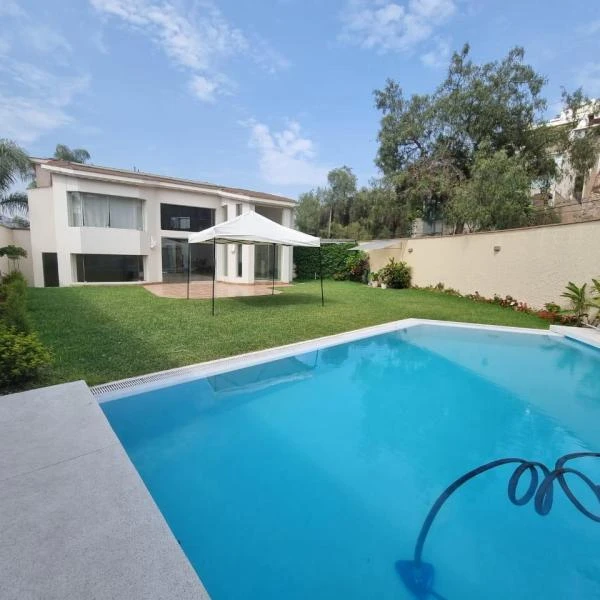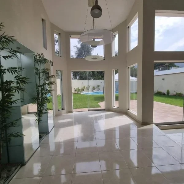 Primer piso Hall de ingreso sala y comedor amplios buena iluminacin techos de doble altura bao de visitas estar jardn terraza garaje escritorios con medio bao incorporado Cocina con tablero de granito encimera elctrica horno empotrado despensas y comedor de diario Dormitorio y bao de servicio depsito jardn piscina jacuzzi y cada de agua