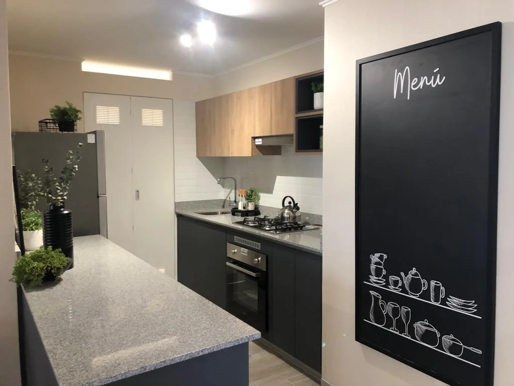 • Cocina americana con muebles altos y bajos.