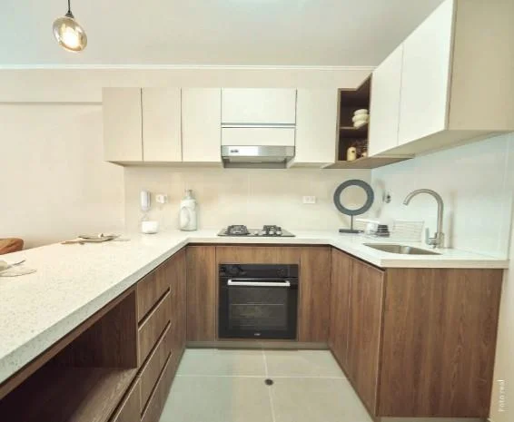 - Cocina cerrada con elegantes acabados, muebles altos y bajos