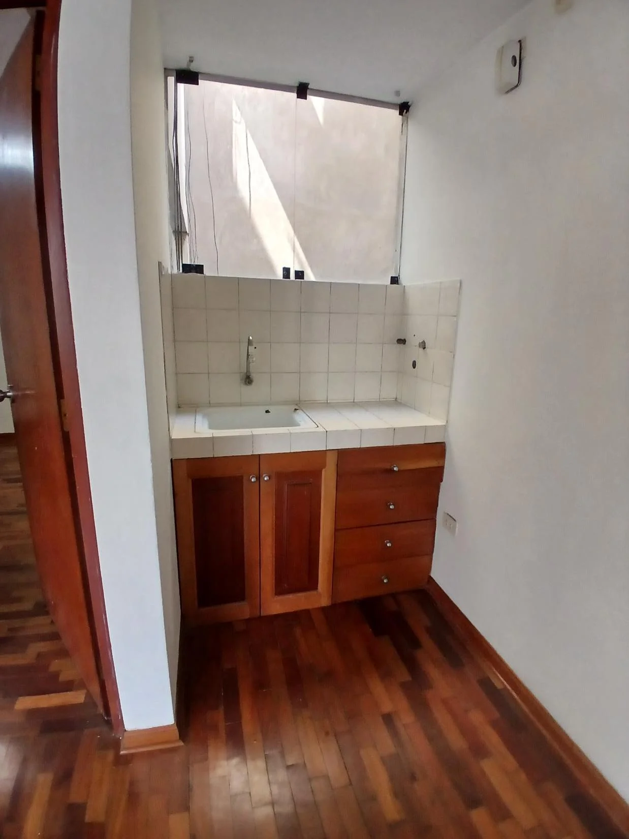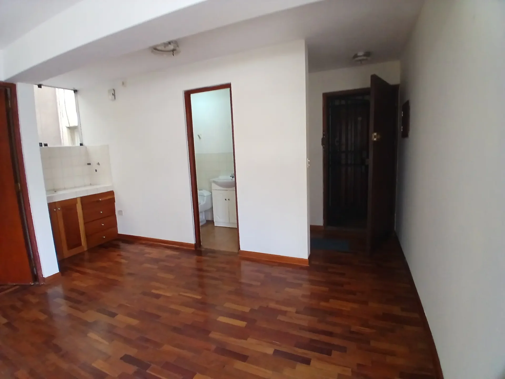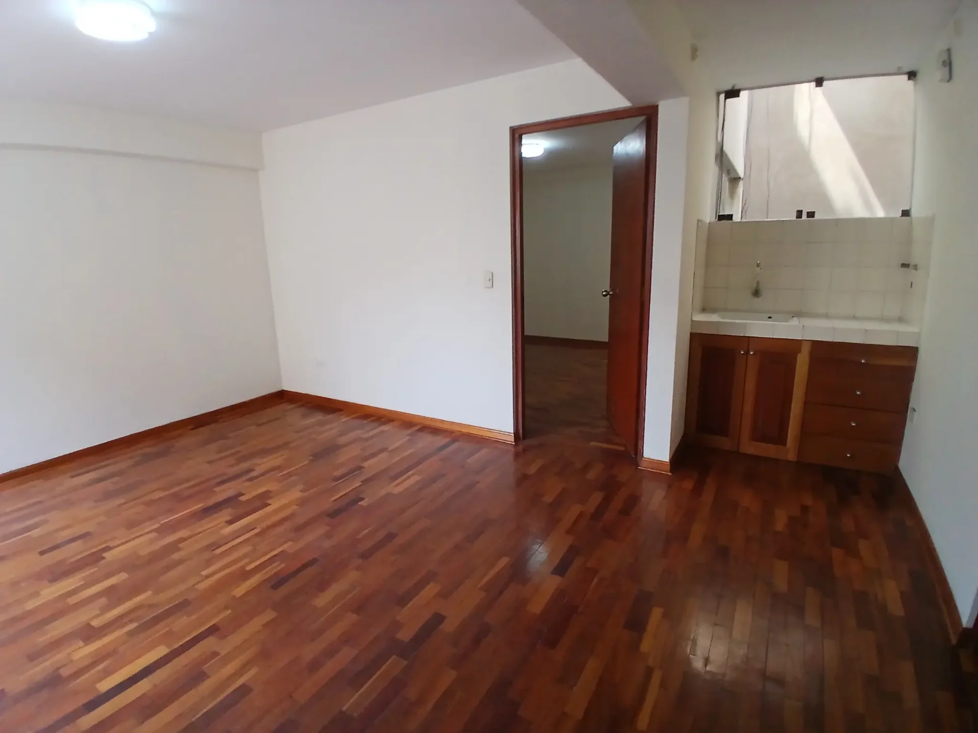 Consta de un ambiente espacioso que puede ser un hall recibidor o una salita-comedor, un espacio con lavadero y cajonería que puede ser usado como kitchenette, un baño grande completo con ducha y un dormitorio amplio u oficina muy bien iluminado.