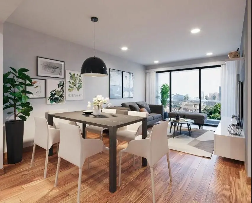 El departamento cuenta con un hall de ingreso que conecta de manera fluida los distintos ambientes. El baño de visitas se encuentra estratégicamente ubicado. La cocina abierta destaca por su mobiliario alto y bajo, así como por su práctica mesada que funciona como comedor de diario. La sala y comedor ofrecen amplitud, luminosidad y confort, además de un balcón que conecta con el exterior. La lavandería brinda practicidad para las tareas del hogar.