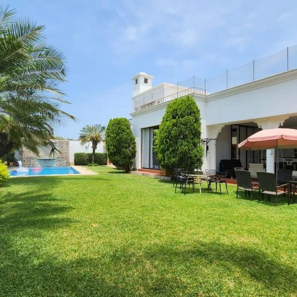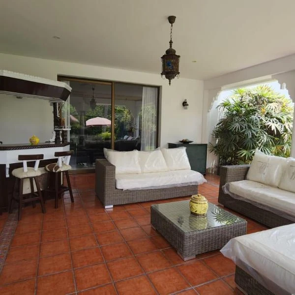 Gran terraza con bello jardn y piscina