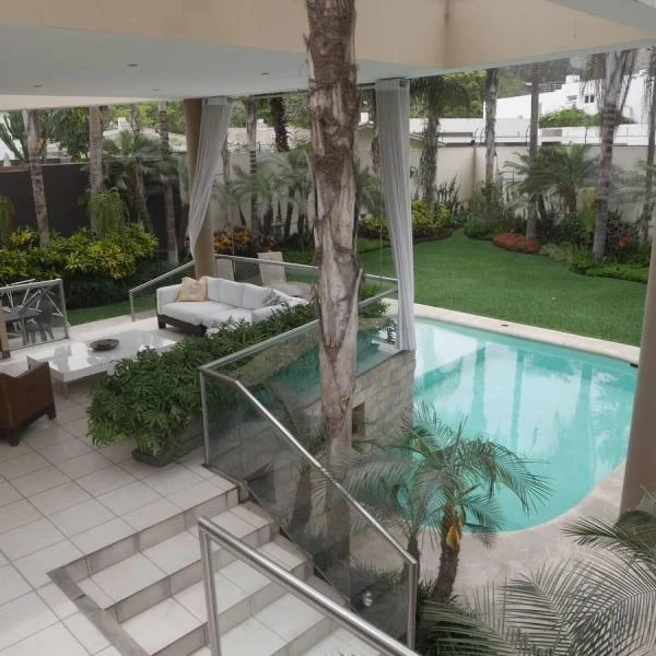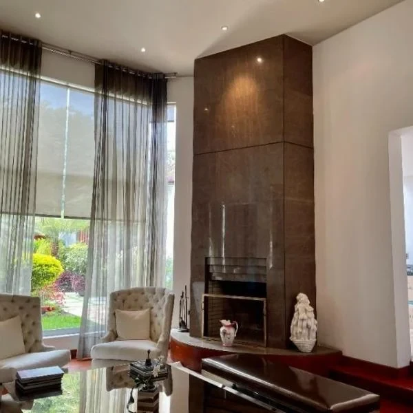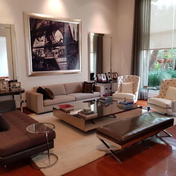 Hall de ingreso sala principal con chimenea salas de estar comedor separado escritorio terraza con techos altos zona BBQ hermoso jardn piscina