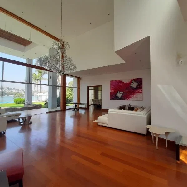 Se vende preciosa y lujosa Residencia con borde a la Laguna de La Molina Exclusiva arquitectura con techos altos Finos acabados Desde el ingreso a la casa se tiene vista hacia la laguna techos a doble altura con dos hermosas lmparas colgantes muy iluminada y de amplios espacios