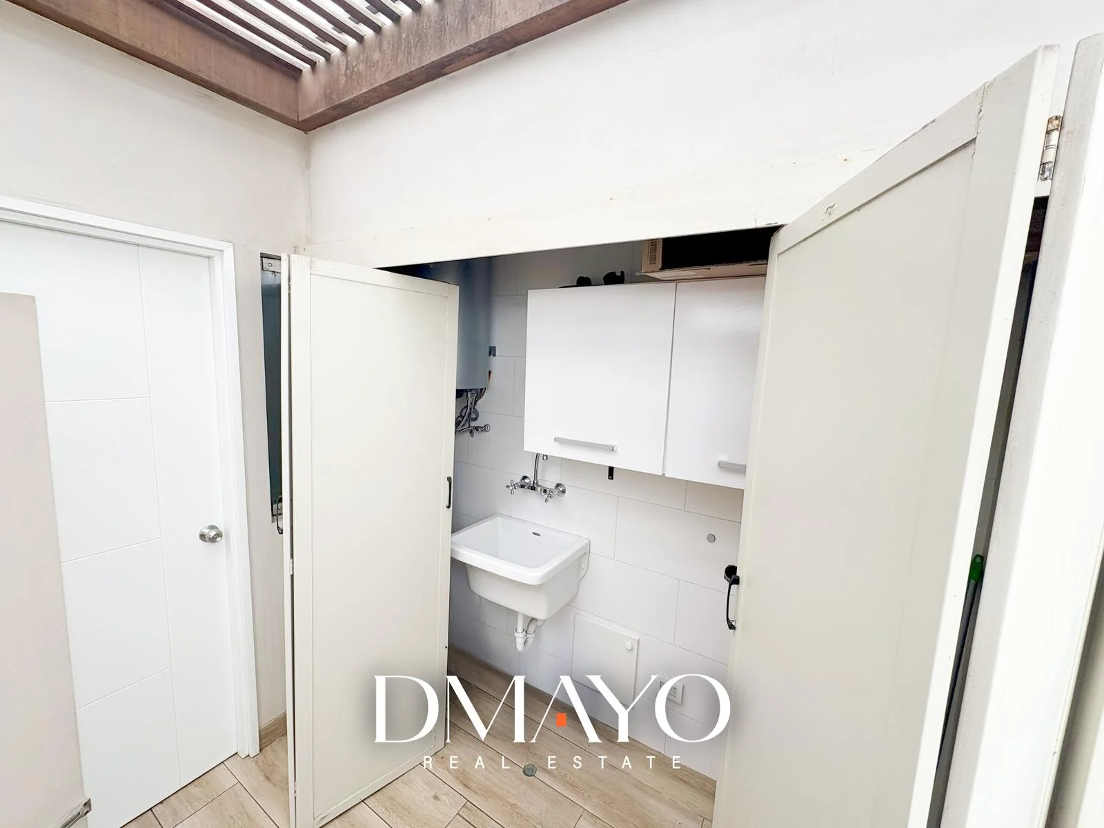 Área de lavandería y patio posterior con jardín
