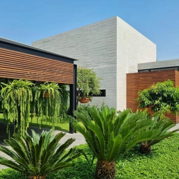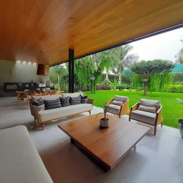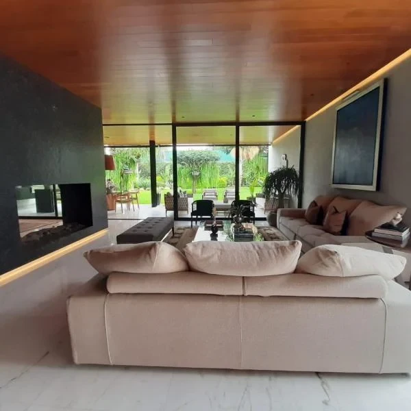 UNA PLANTA Amplio Hall de ingreso Sala con techos altos chimenea comedor amplio ambos con vista a jardines y a una gran terraza Bao de visitas Cocina con isla reposteros altos y bajos con tableros de cuarzo despensa y comedor de diario Amplia terraza con zona BBQ Gran family room que podra ser escritorio Dormitorios con bao incorporado cada uno Gran dormitorio principal tipo suite con walk in closet de m Sauna zona de masajes con acceso a jacuzzi piscina