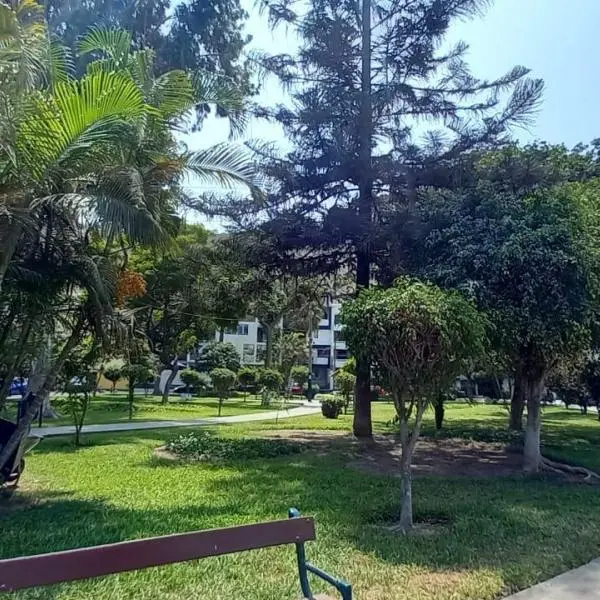 No tiene estacionamiento Los autos se estacionan alrededor del parque la zona es cerrada y cuenta con seguridad