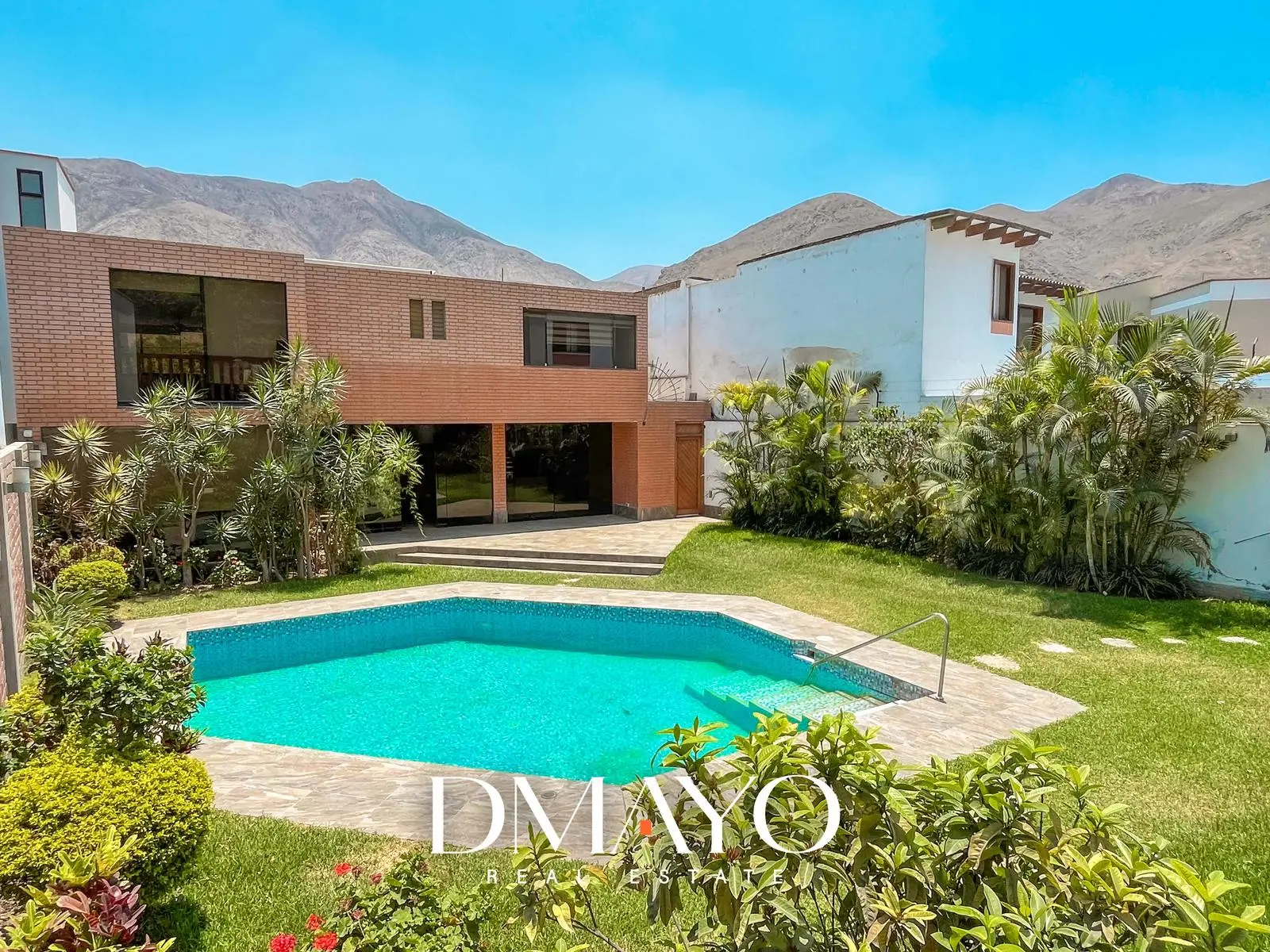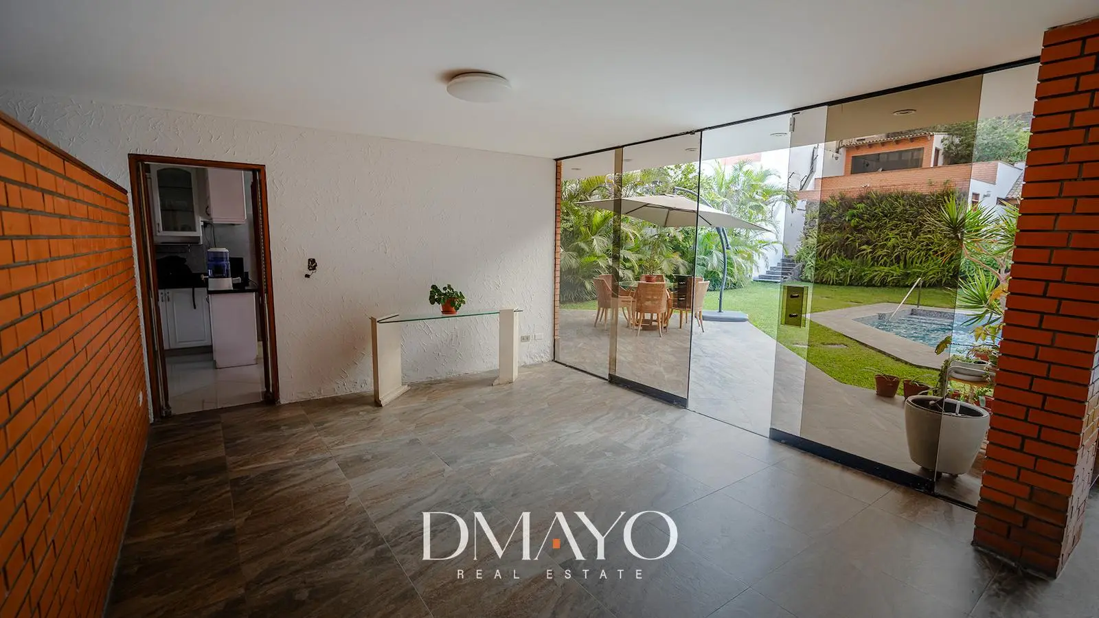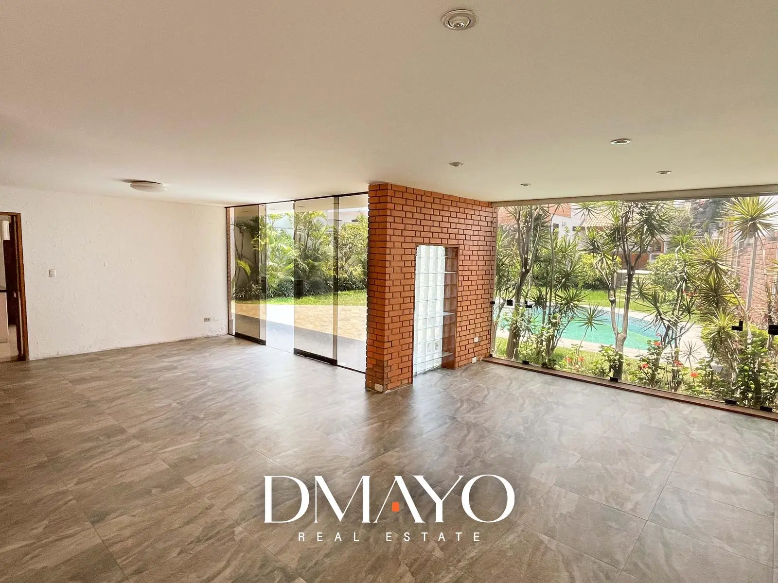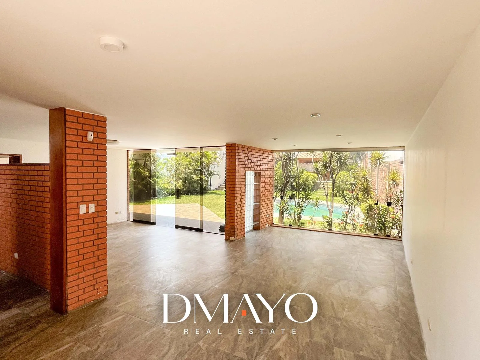 Primer Piso: Elegante hall de ingreso, amplia sala comedor con vista al jardín y piscina. Cocina moderna con isla de granito, terraza con parrilla y horno.