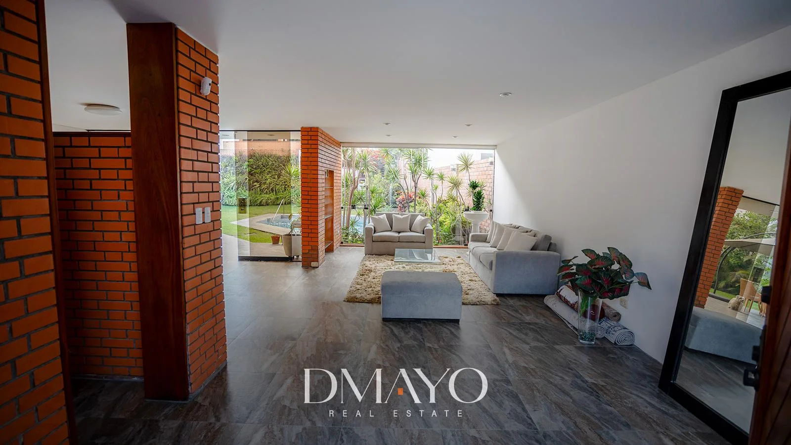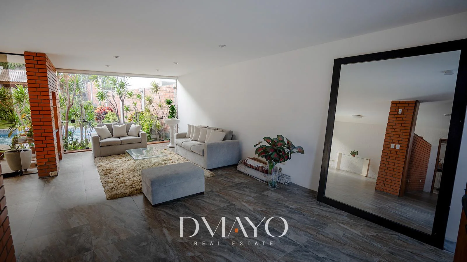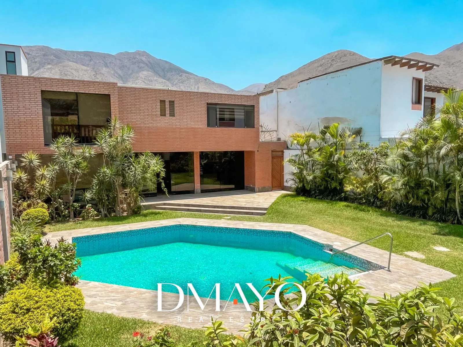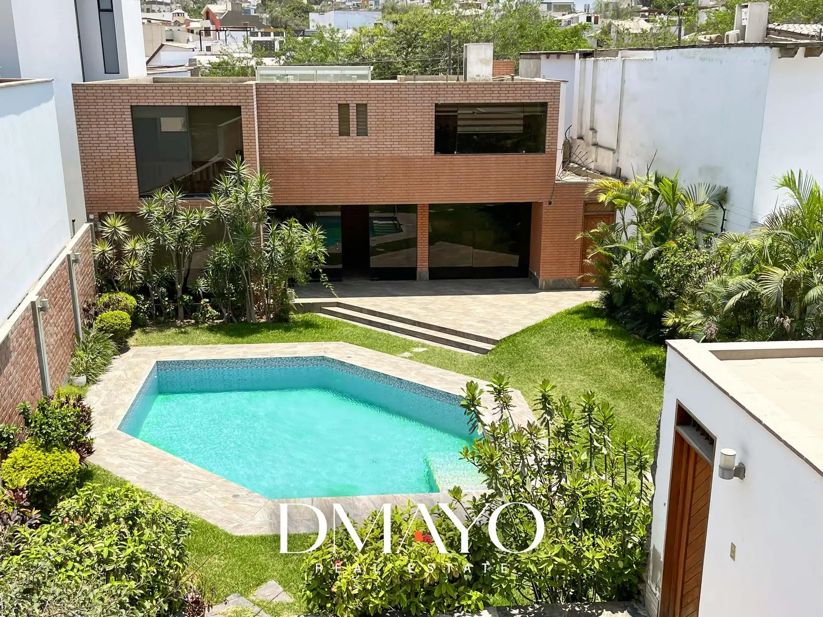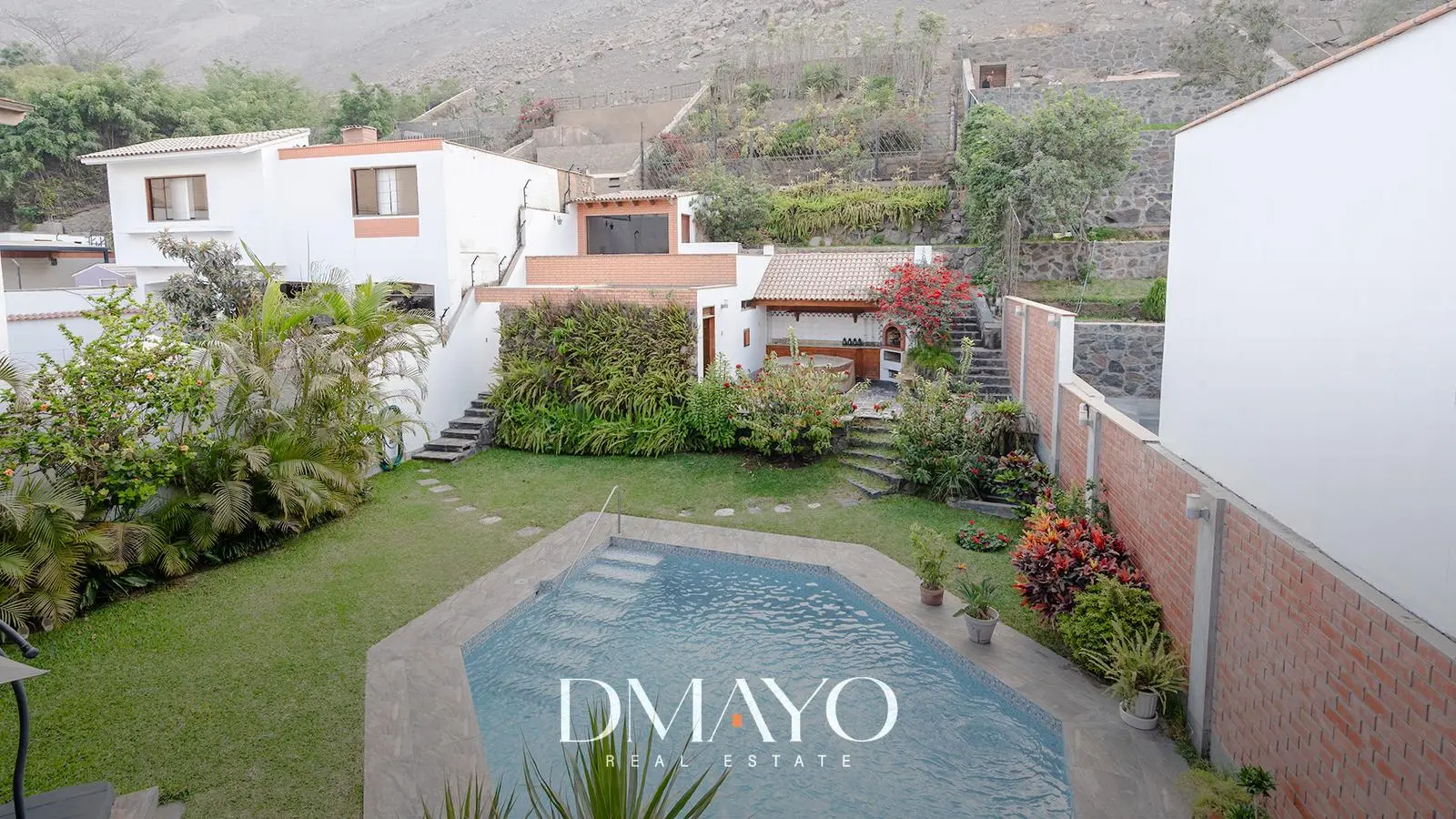 Primer Piso: Elegante hall de ingreso, amplia sala comedor con vista al jardín y piscina. Cocina moderna con isla de granito, terraza con parrilla y horno.