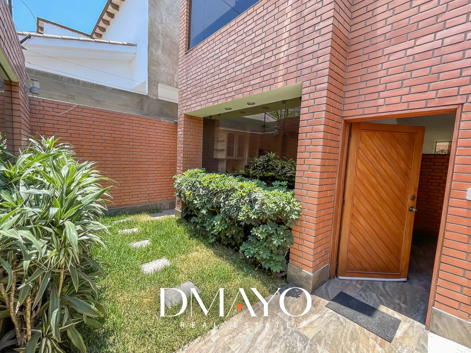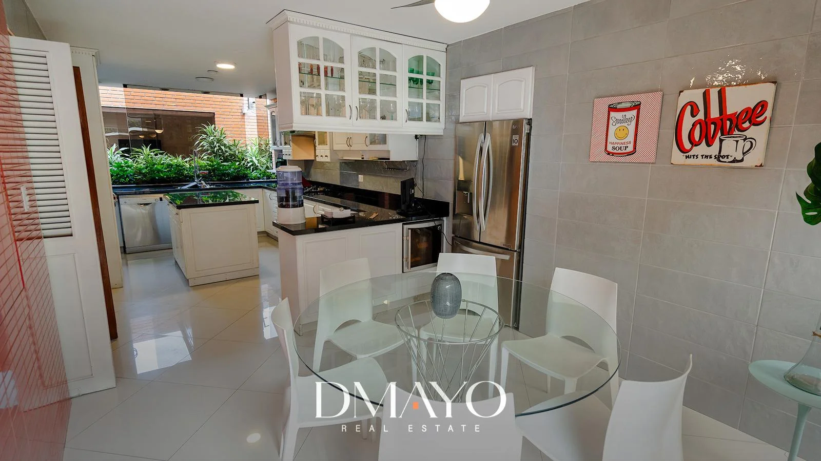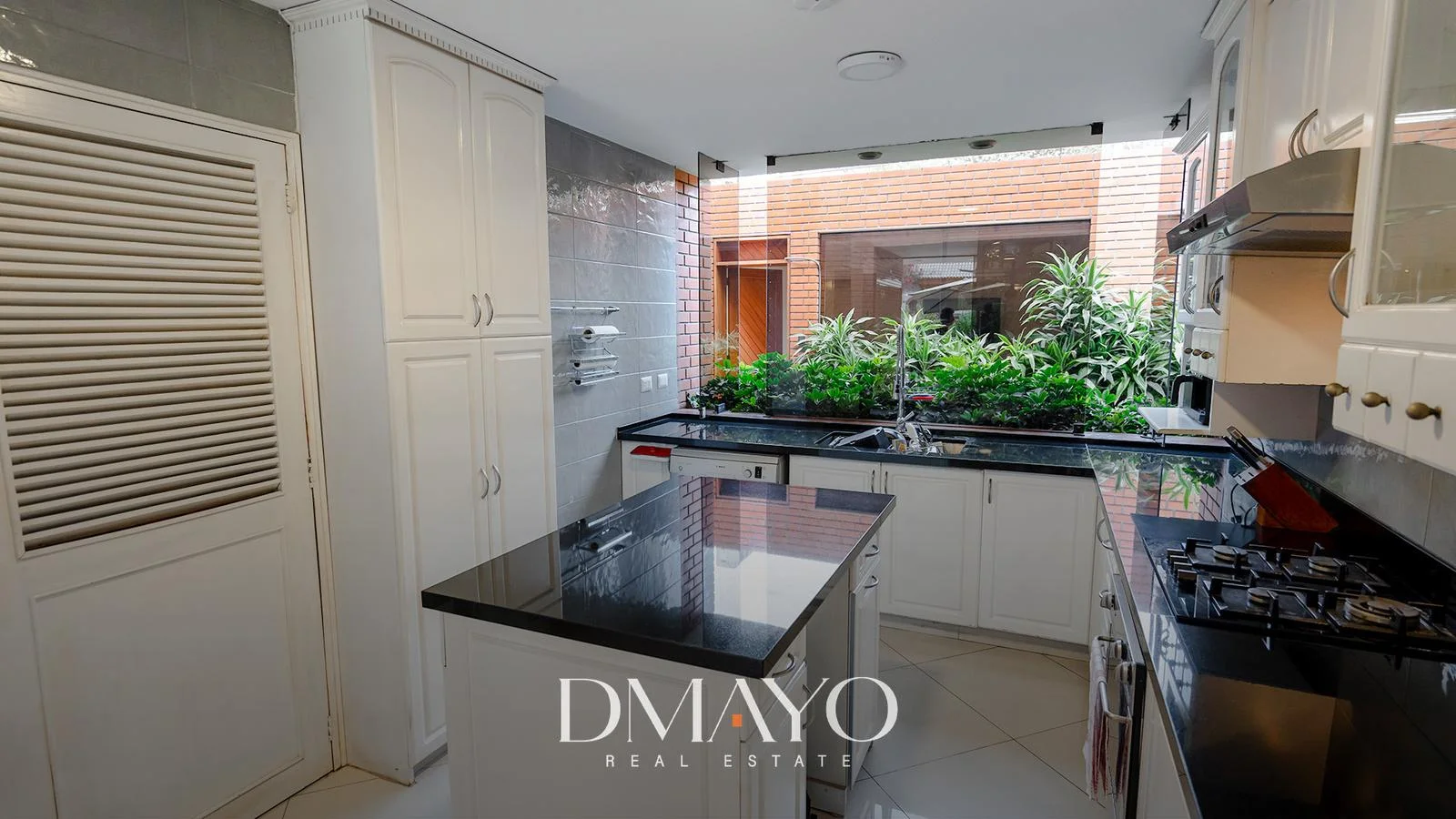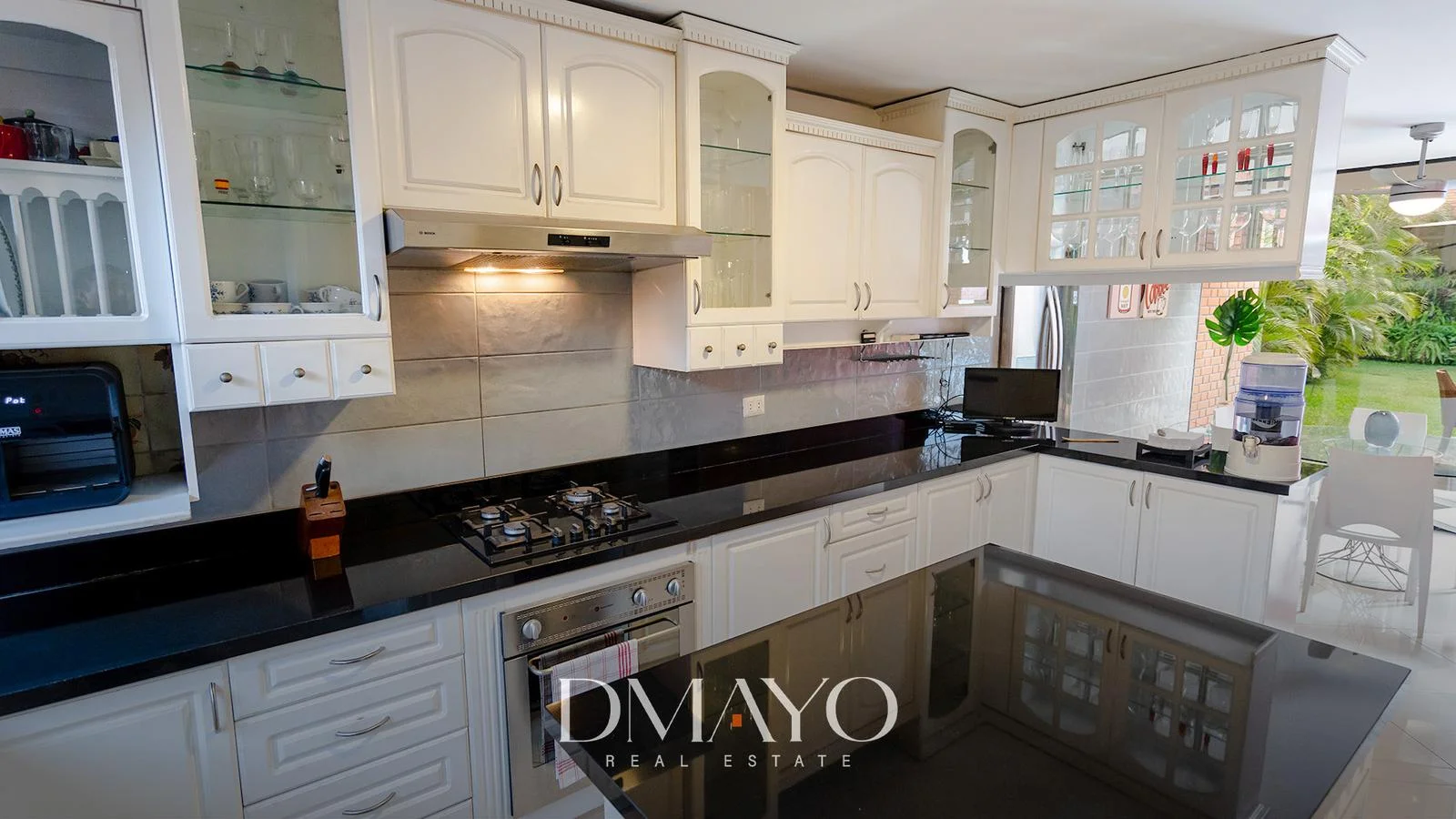 Primer Piso: Elegante hall de ingreso, amplia sala comedor con vista al jardín y piscina. Cocina moderna con isla de granito, terraza con parrilla y horno.