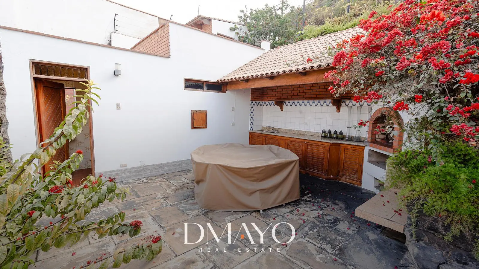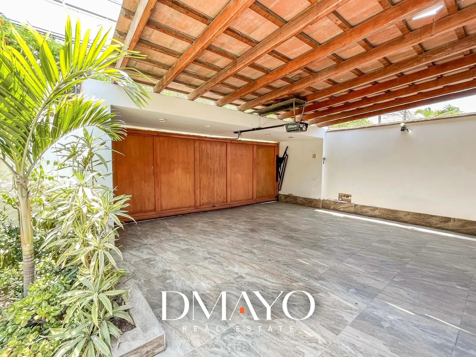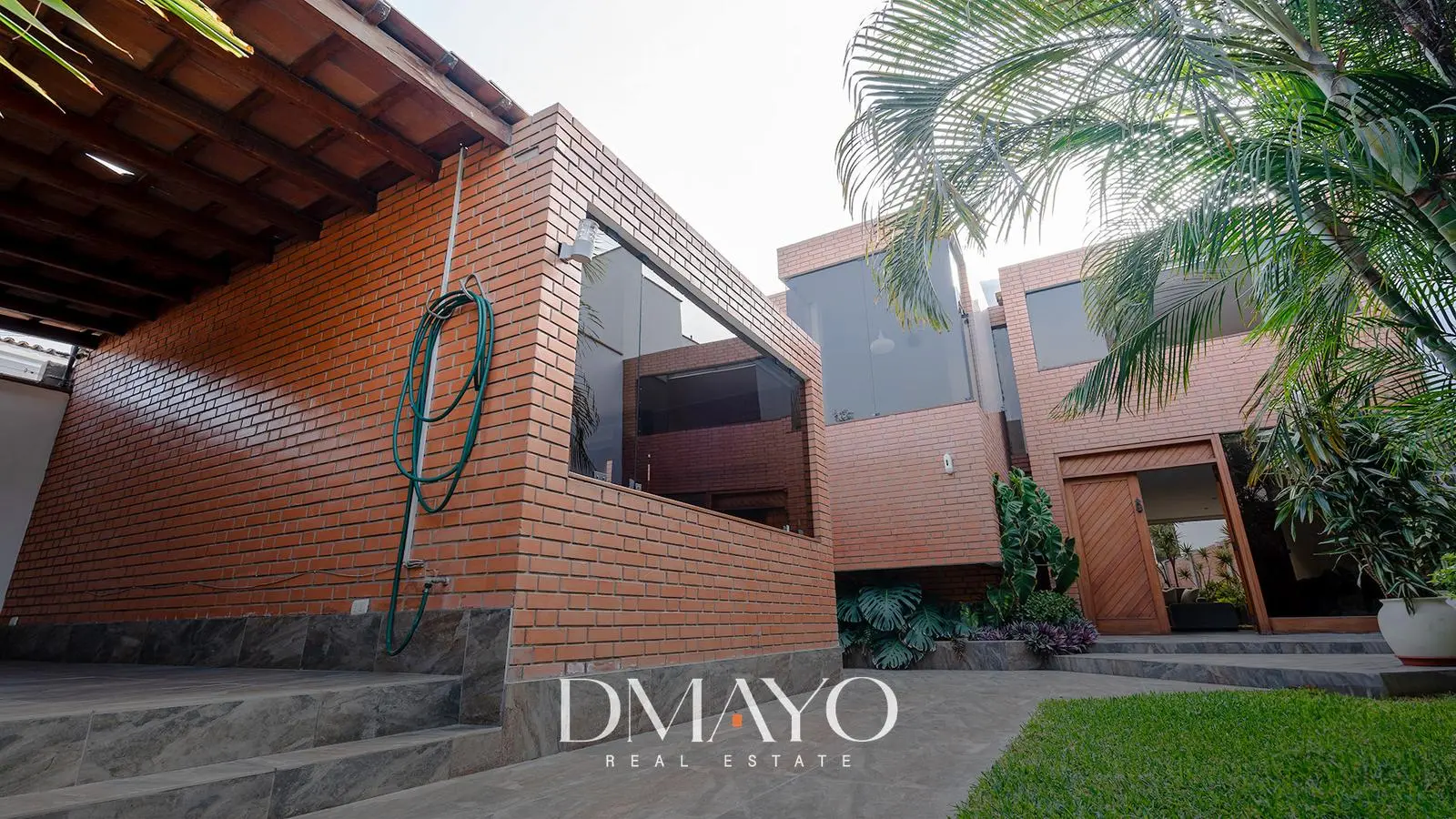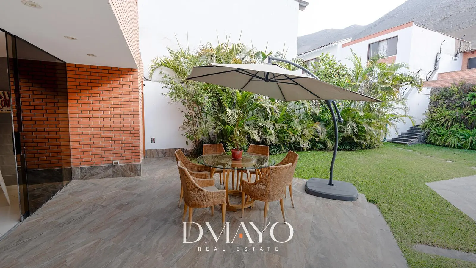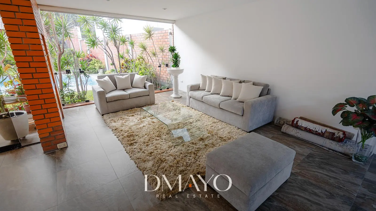Primer Piso: Elegante hall de ingreso, amplia sala comedor con vista al jardín y piscina. Cocina moderna con isla de granito, terraza con parrilla y horno.