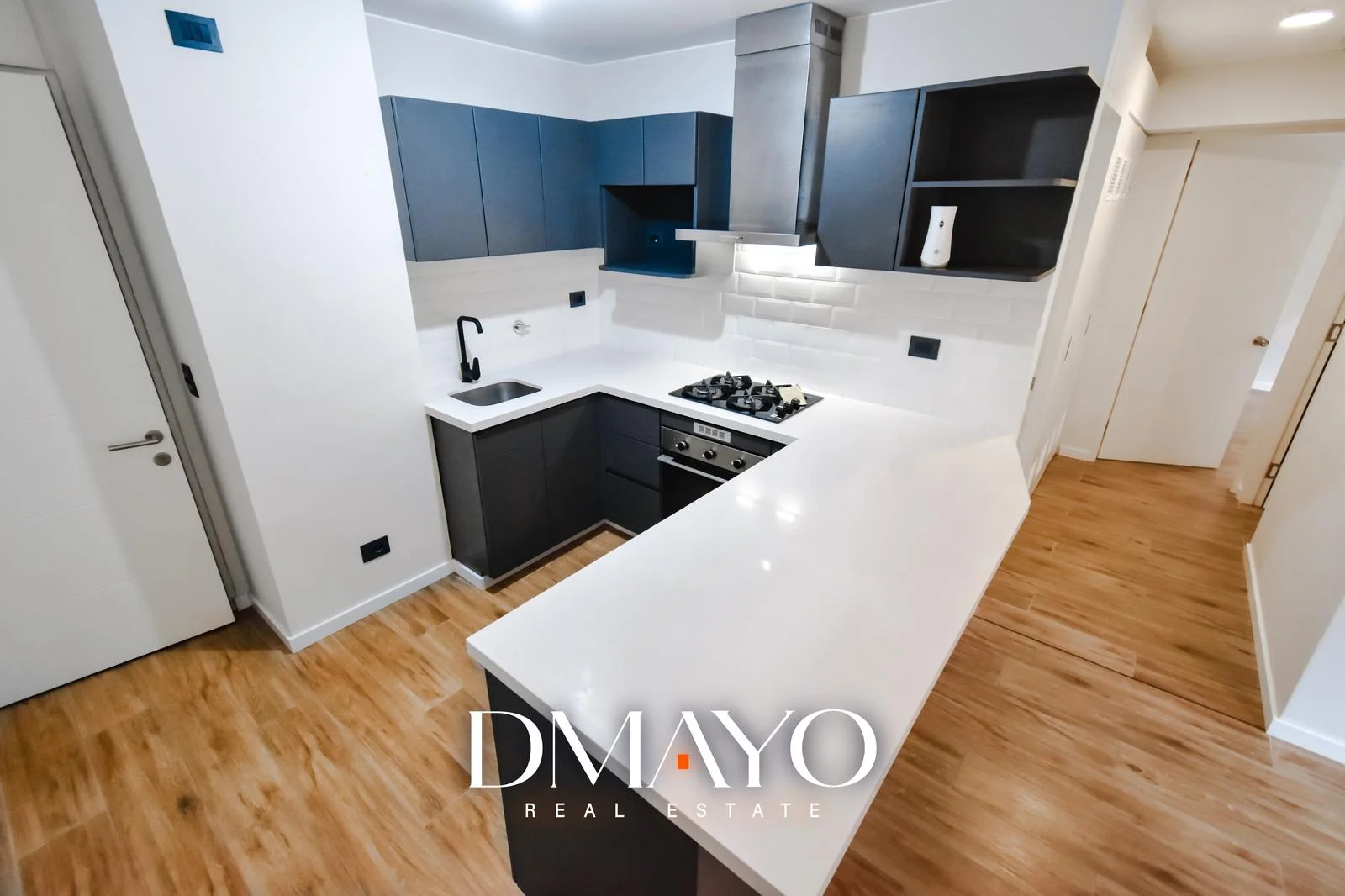 Elegantes acabados de cuarzo blanco y muebles grises, griferías negras que añaden un toque distintivo.