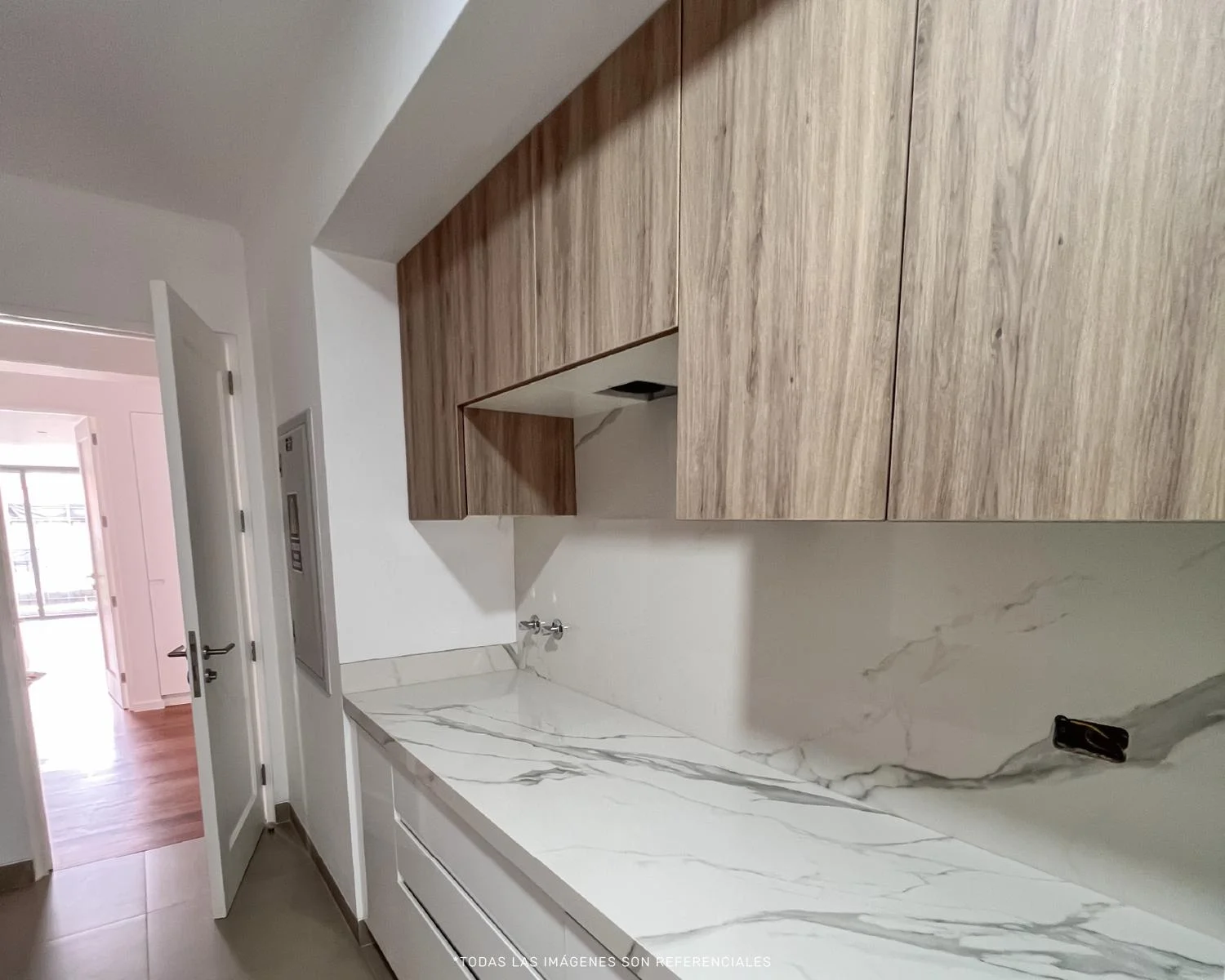 Cocina moderna, con muebles altos y bajos para mayor almacenamiento.