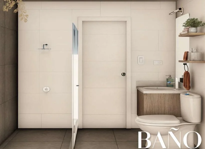 Los acabados son de alta calidad: pisos SPC que imitan la madera, tablero de piedra sintetizada en la cocina y cuarzo blanco en los baños. Se entrega con encimera, horno y campana marca KITCHEN CENTER.
