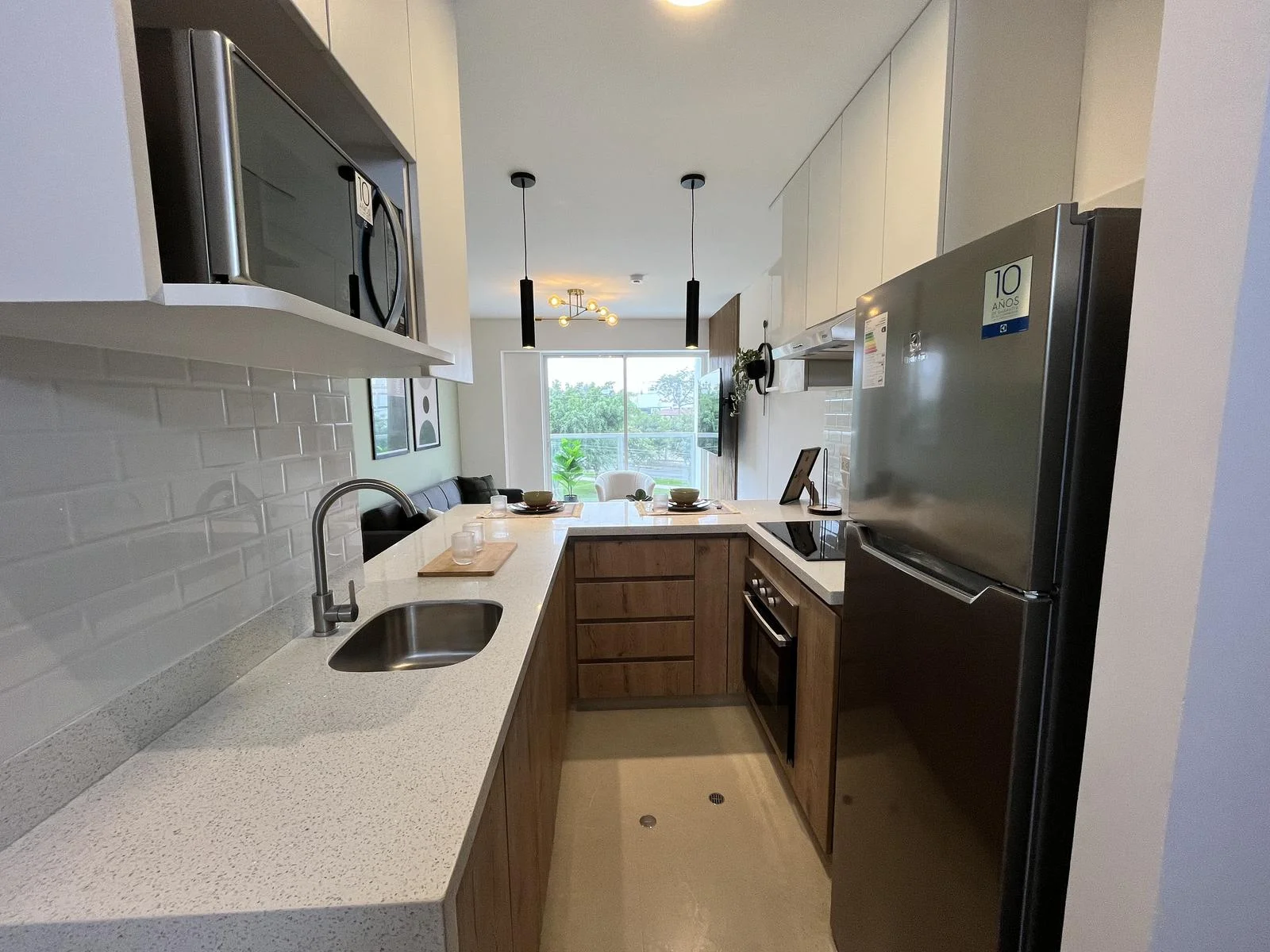 El Departamento 202 combina diseño y funcionalidad. Cuenta con un hall de entrada que da paso a una cómoda sala-comedor, ideal para descansar o recibir visitas. La cocina abierta está equipada con muebles altos y bajos de diseño moderno, y se entrega completamente equipada con encimera, horno y campana extractora. Desde la sala, se accede a un balcón exterior, un espacio adicional perfecto para disfrutar del aire libre o decorar con plantas.