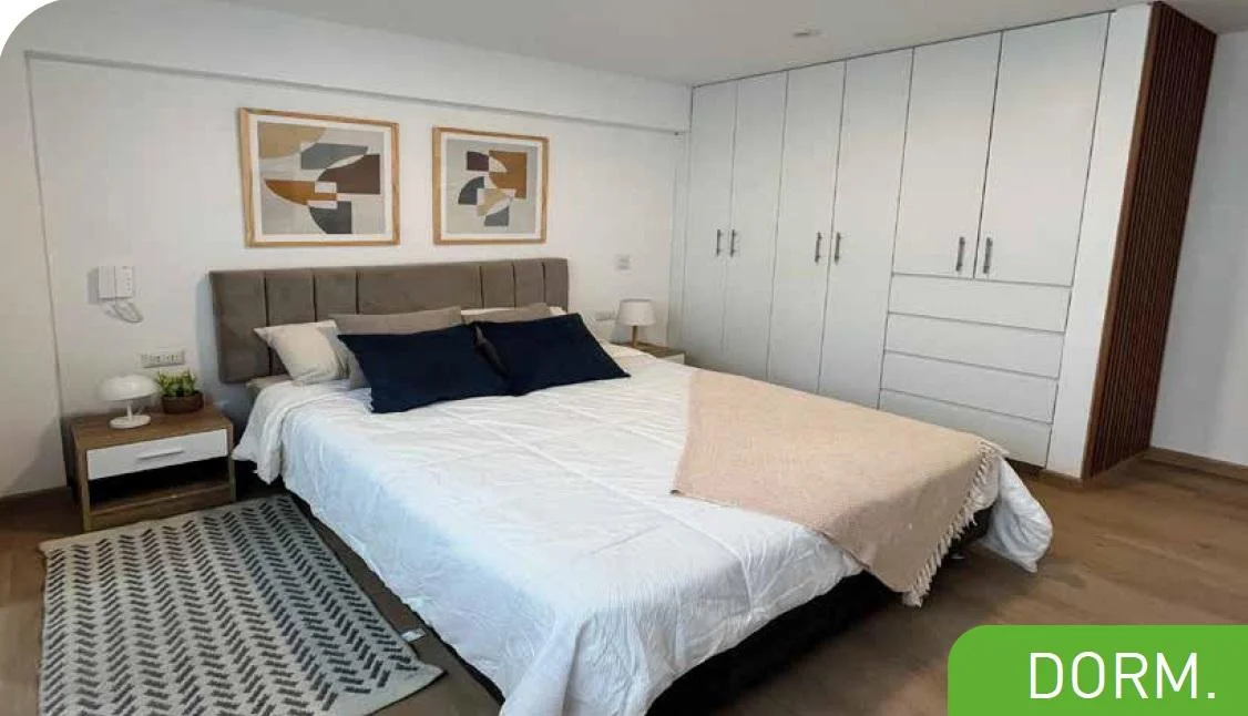 El departamento incluye también un centro de lavado, dos dormitorios con clósets completos y dos baños totalmente equipados. El dormitorio principal cuenta con baño privado, ofreciendo mayor privacidad y comodidad.