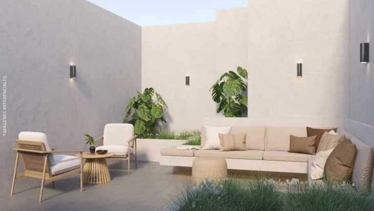 Tiene tres dormitorios con clósets completos. El dormitorio principal incluye baño incorporado, mientras que los dormitorios secundarios comparten un baño completo. Un detalle destacado de este modelo es que uno de los dormitorios cuenta con terraza interior privada, ideal como zona de lectura, descanso o incluso para quienes deseen incorporar vegetación o un pequeño espacio exterior sin salir del departamento.