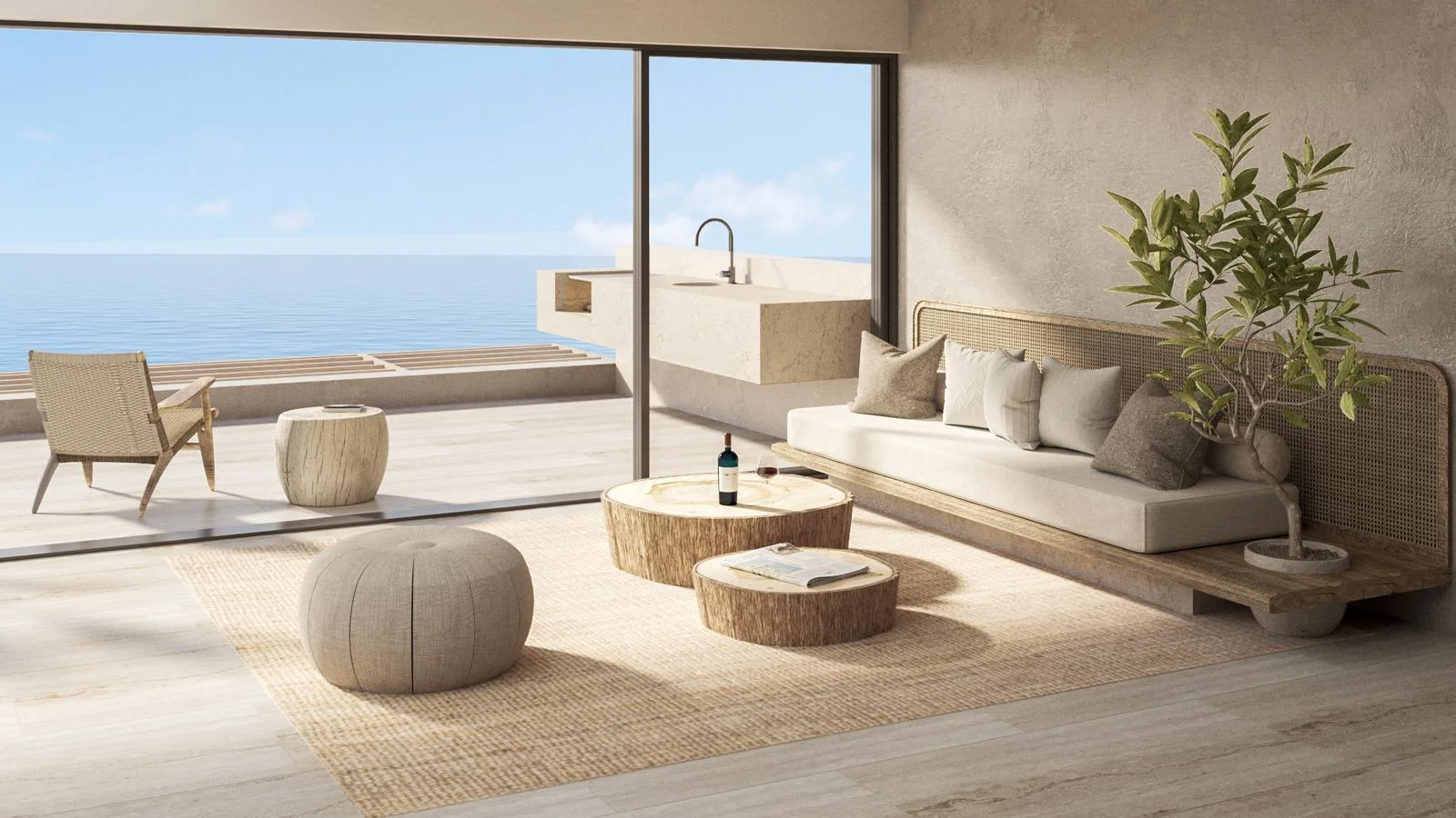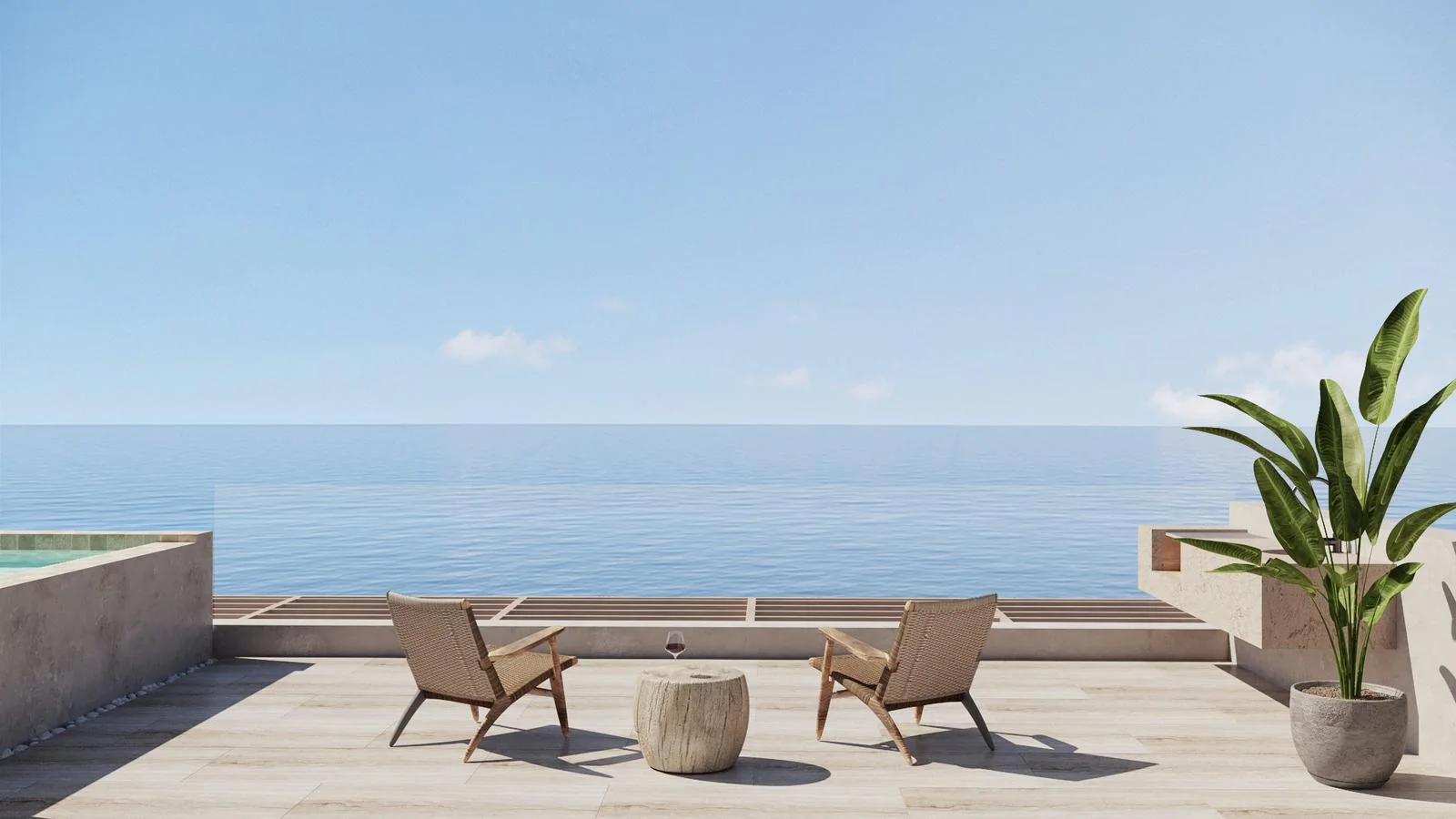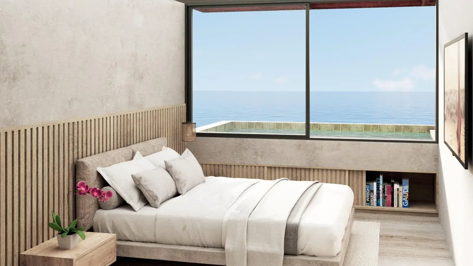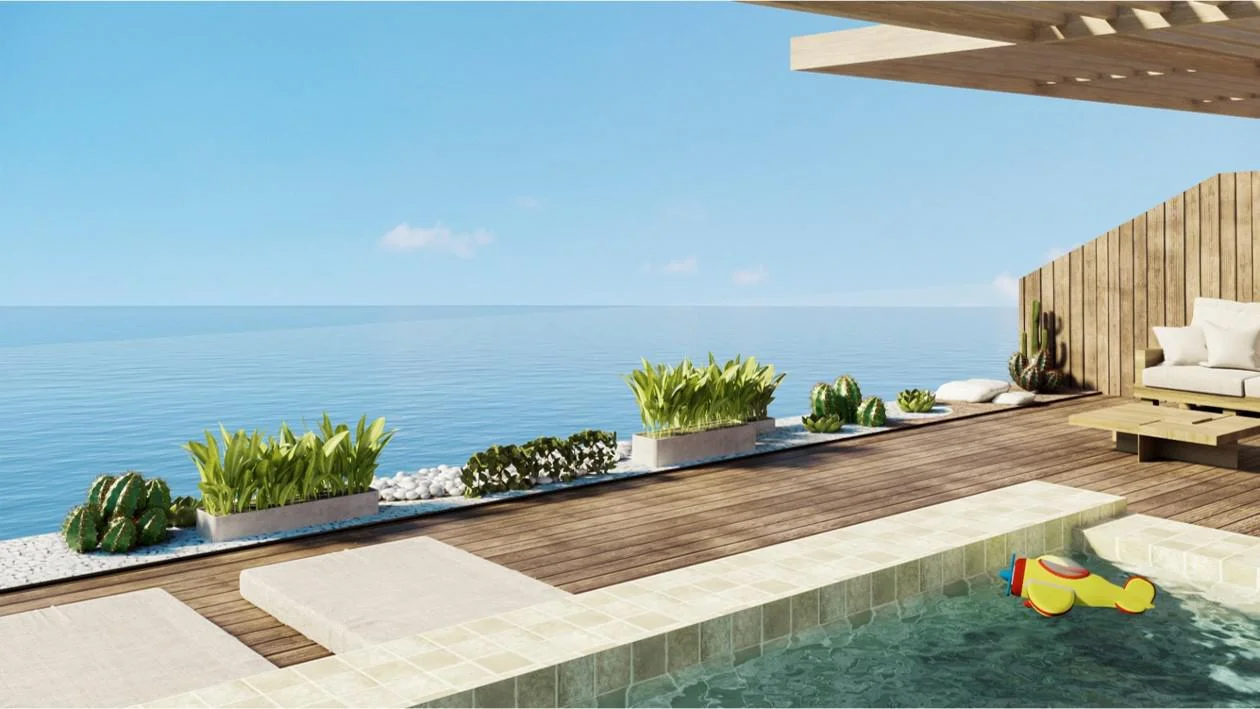 Tercer piso - Sala de estar, patio interior, 1 dormitorio con baño incorporado. Area para gimnasio, baño completo. Todo con vista al mar.