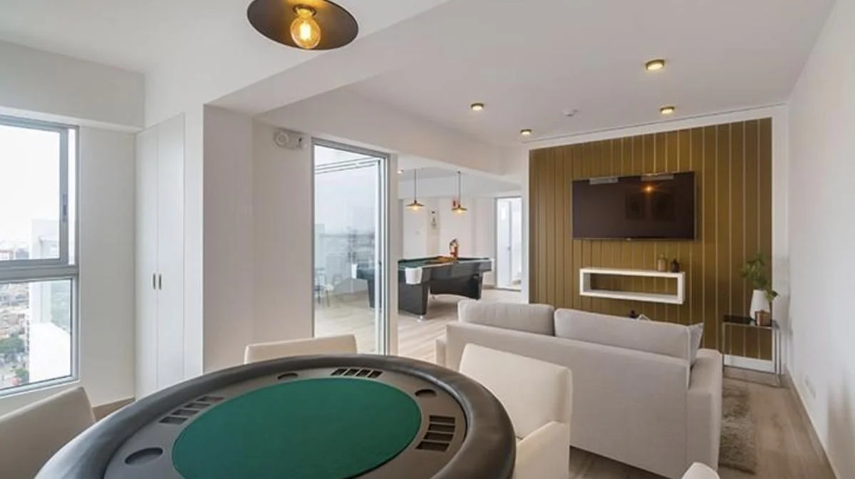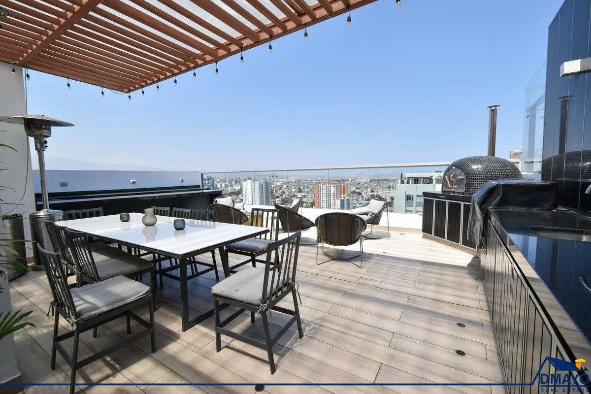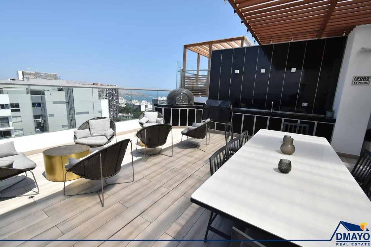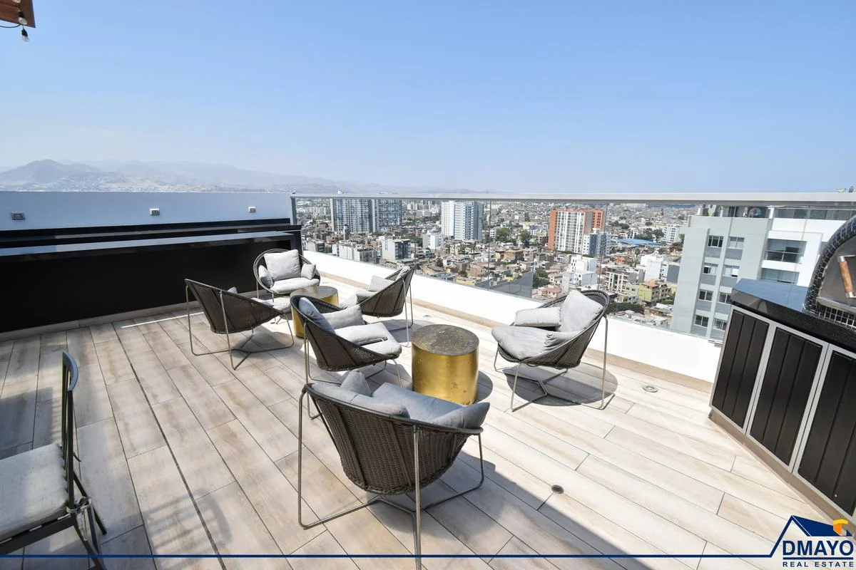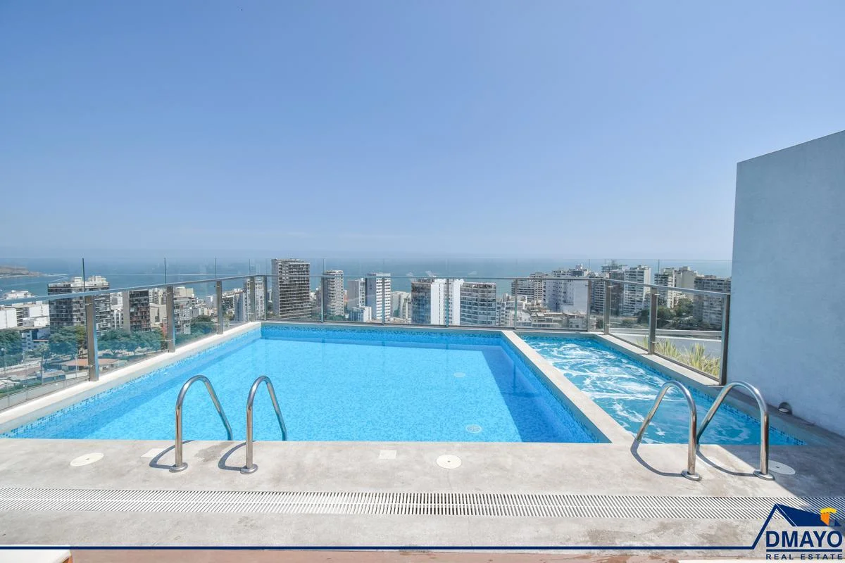 Piscina con vista panorámica. Jacuzzi. Zona de coworking, sala de juegos con mesa de billar, zona de parrillas, SUM, Gimnasio, lavandería autoservicio, rooftop, lobby con seguridad 24/7.
