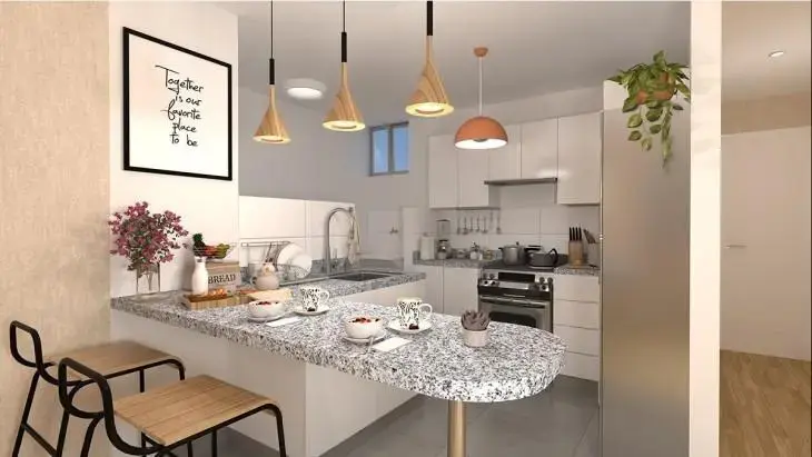 El diseño interior, caracterizado por su estilo "flat", revela un cuidadoso equilibrio entre elegancia y funcionalidad. Al ingresar, un hall de ingreso acoge a los residentes y sus invitados, marcando la pauta para un hogar sofisticado. La espaciosa zona de estar y comedor ofrece un ambiente acogedor, ideal para momentos de reunión y relajación. La cocina, meticulosamente equipada, fusiona la estética contemporánea con la practicidad, convirtiéndose en el corazón funcional del hogar.