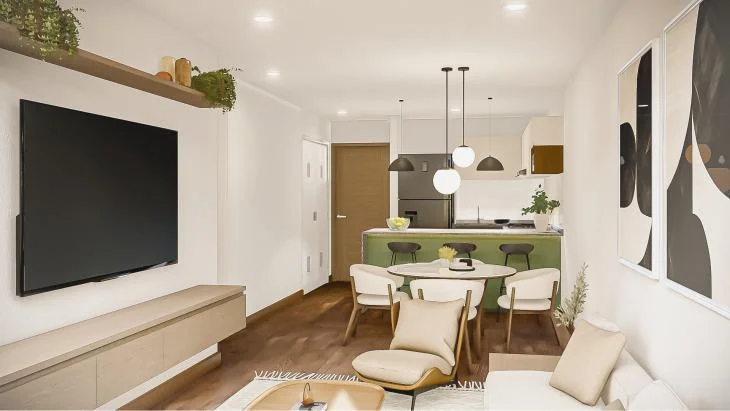 Este acogedor departamento ha sido diseñado para brindar practicidad y comodidad en cada uno de sus ambientes. Al ingresar, se encuentra una sala-comedor bien iluminada que se convierte en el corazón del hogar, perfecta para recibir visitas, compartir momentos familiares o simplemente disfrutar de un espacio tranquilo al final del día. La distribución integra de manera armónica el kitchenette, el cual ofrece un estilo moderno y funcional, ideal para quienes valoran la practicidad sin perder el sentido estético, ya que permite preparar las comidas mientras se mantiene la conexión con el área social.