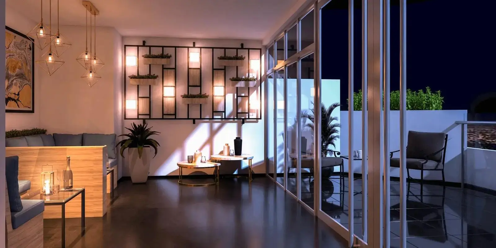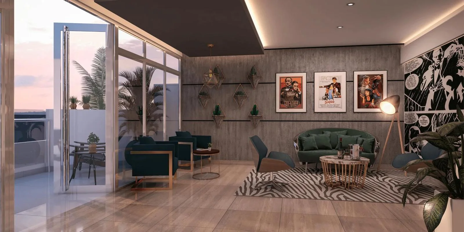 Áreas comunes: Lobby, Piscina temperada, Zona pizzas, Gym, Sala dance, Sala cine, Sky lounge, Karaoke, entre otros.