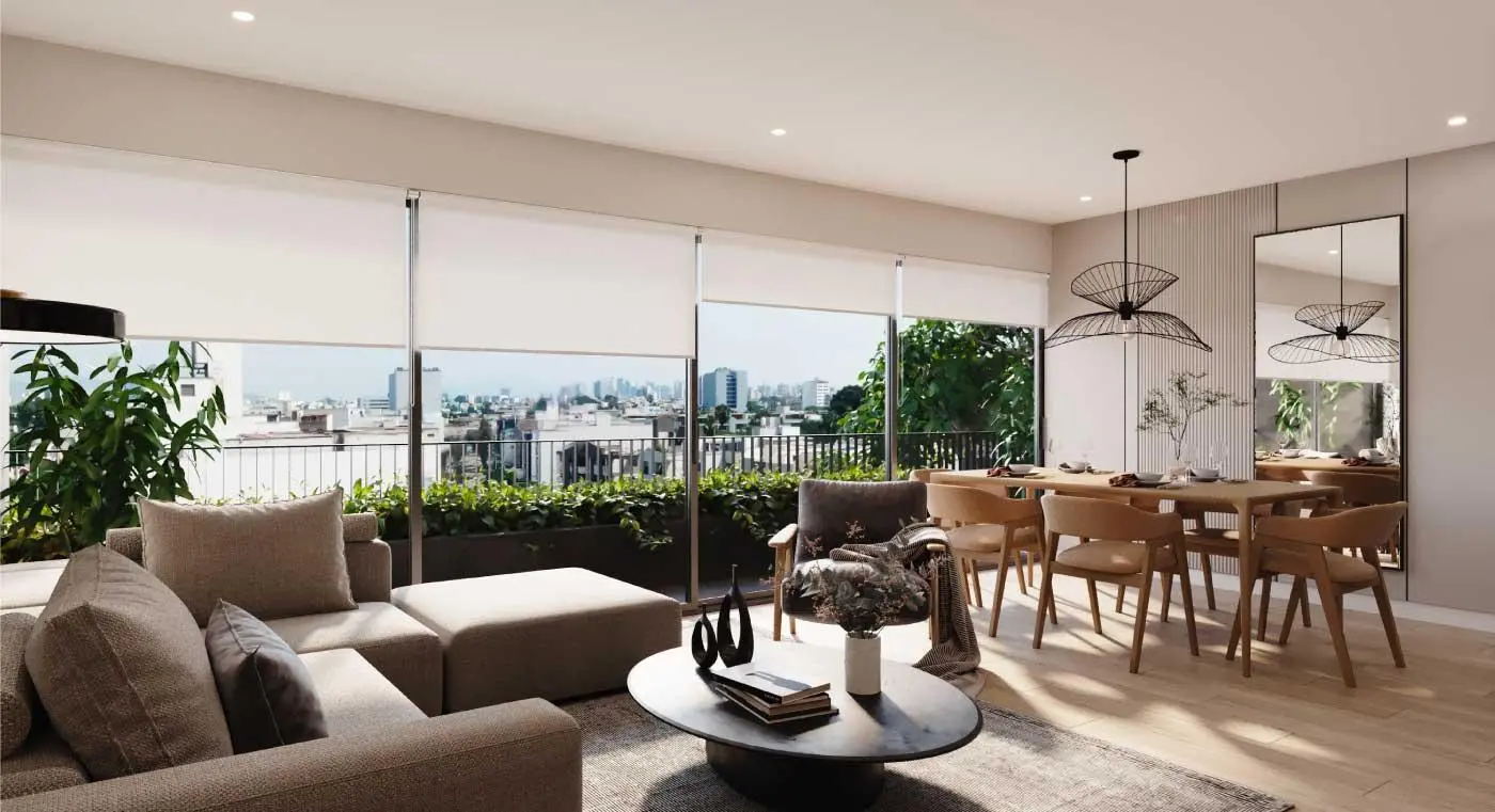 Cuenta con sala-comedor, kitchenette, comedor de diaro, 3 dormitorios, 3 baños, baño de visita, sala de estar, lavandería, 1 baño de servicio, terraza.