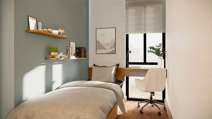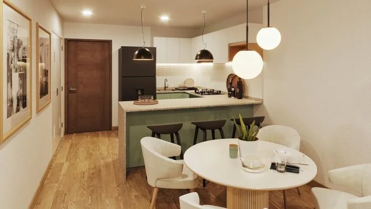 Este departamento ha sido cuidadosamente diseñado para ofrecer una experiencia cómoda, funcional y acogedora. Al ingresar, te recibe una luminosa sala-comedor, un espacio integrado ideal tanto para el descanso diario como para recibir visitas. Gracias a su distribución abierta, este ambiente se conecta con naturalidad al kitchenette, el cual ha sido concebido para aprovechar al máximo cada metro cuadrado, con muebles funcionales y espacio suficiente para preparar tus platos favoritos en un entorno moderno y práctico.