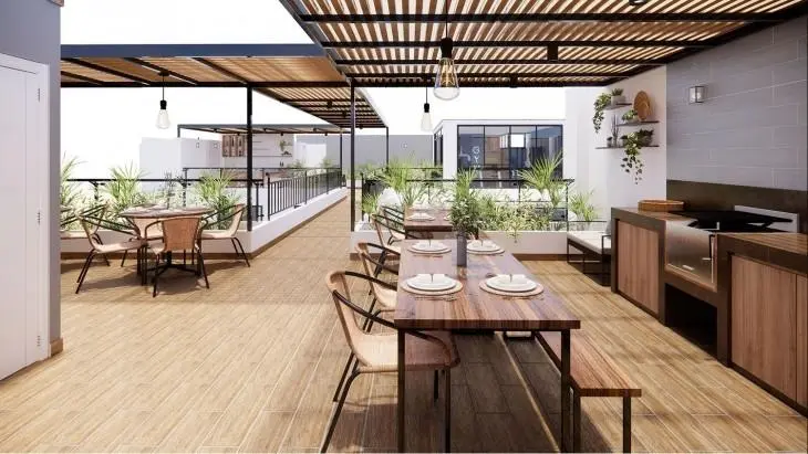 Áreas comunes: Gimnasio, Lobby, Piscina, Sala Bar, Sala de Niños, Sala de usos Múltiples, Zona de Parrillas