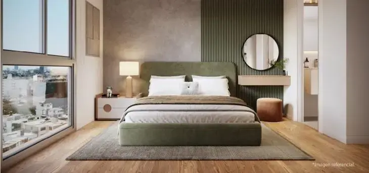 La cocina tipo kitchenette, moderna y práctica, se encuentra estratégicamente ubicada para optimizar el espacio. Cuenta con todo lo necesario para preparar tus platillos favoritos, sin dejar de lado el estilo y la eficiencia. El dormitorio principal es un ambiente privado y tranquilo, pensado para el descanso y la relajación, con espacio suficiente para incorporar mobiliario adicional según las necesidades del residente.