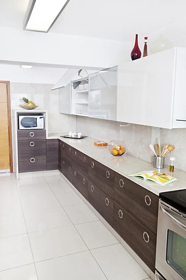 Segundo piso (5to piso) - Ingreso al departamento, sala amplia, comedor, bar, baño de visitas, cocina con muebles altos y bajos, terraza.