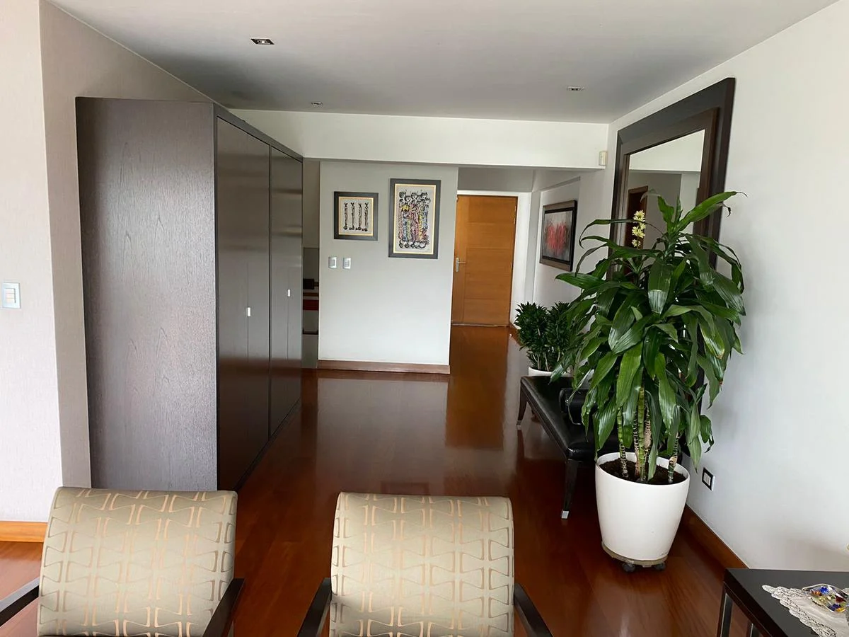 Tercer piso (6to piso) - Sala de estar con aire acondicionado, terraza amplia, BBQ, baño de visitas, patio, lavanderia, cuarto y baño de servicio.