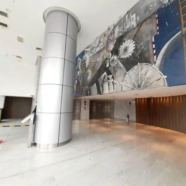 Edificio de ascensores y elegante lobby de doble altura