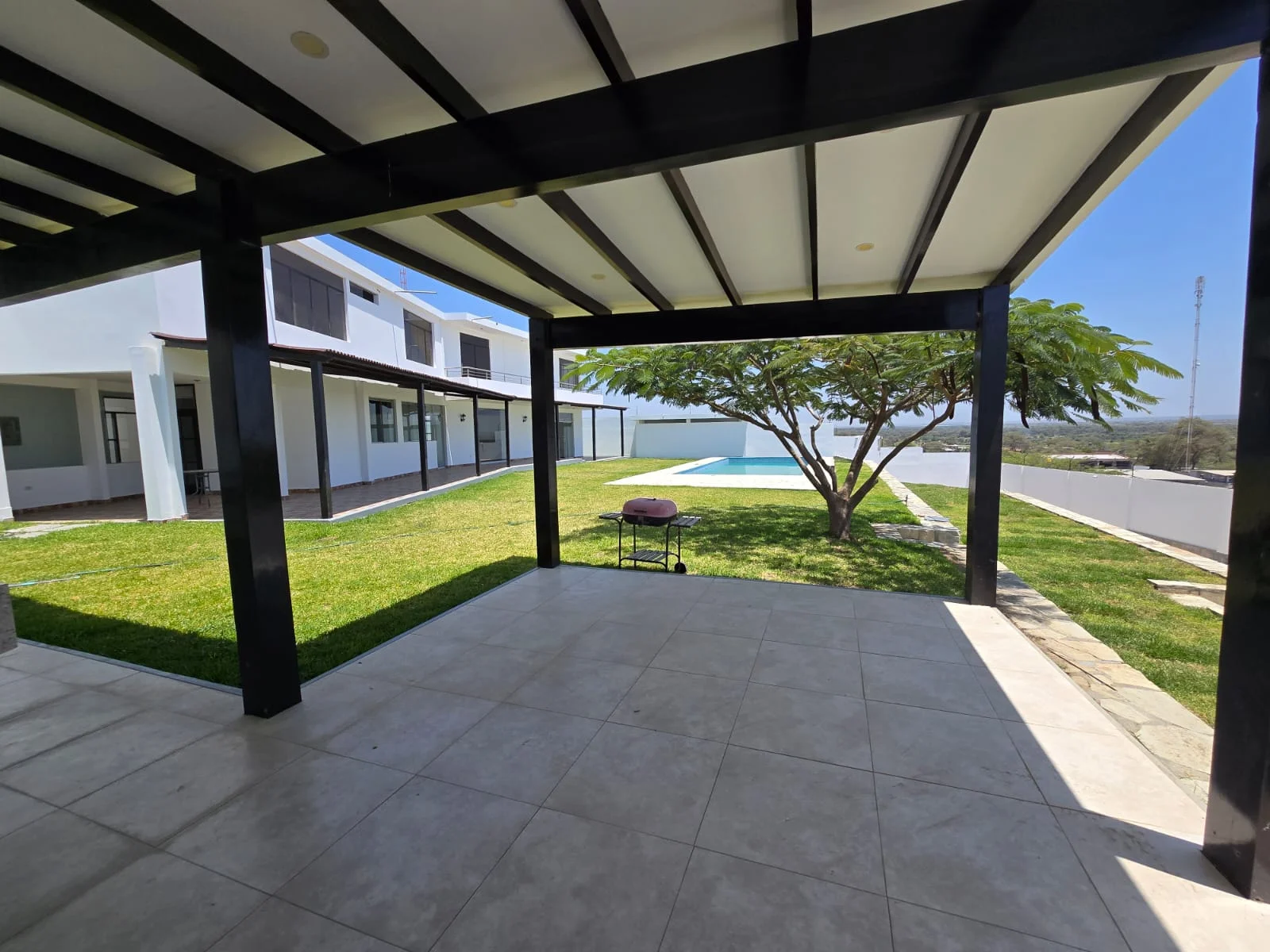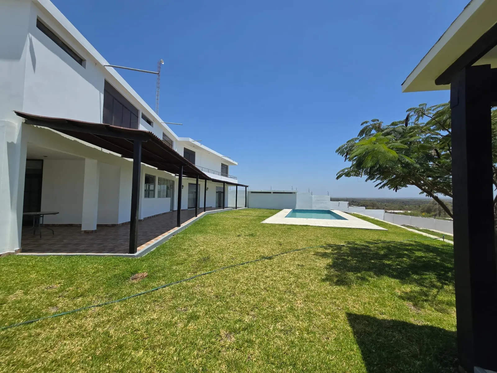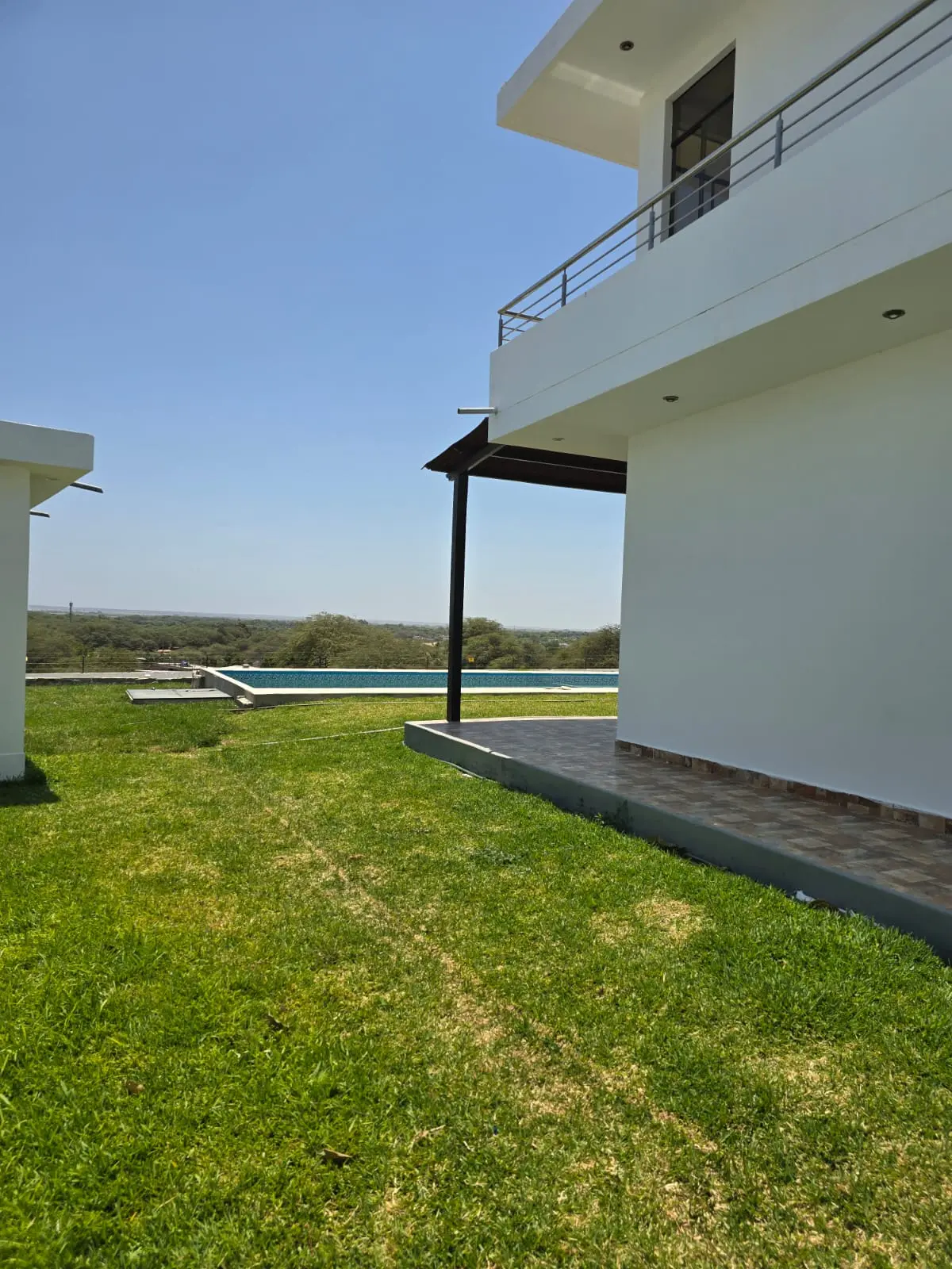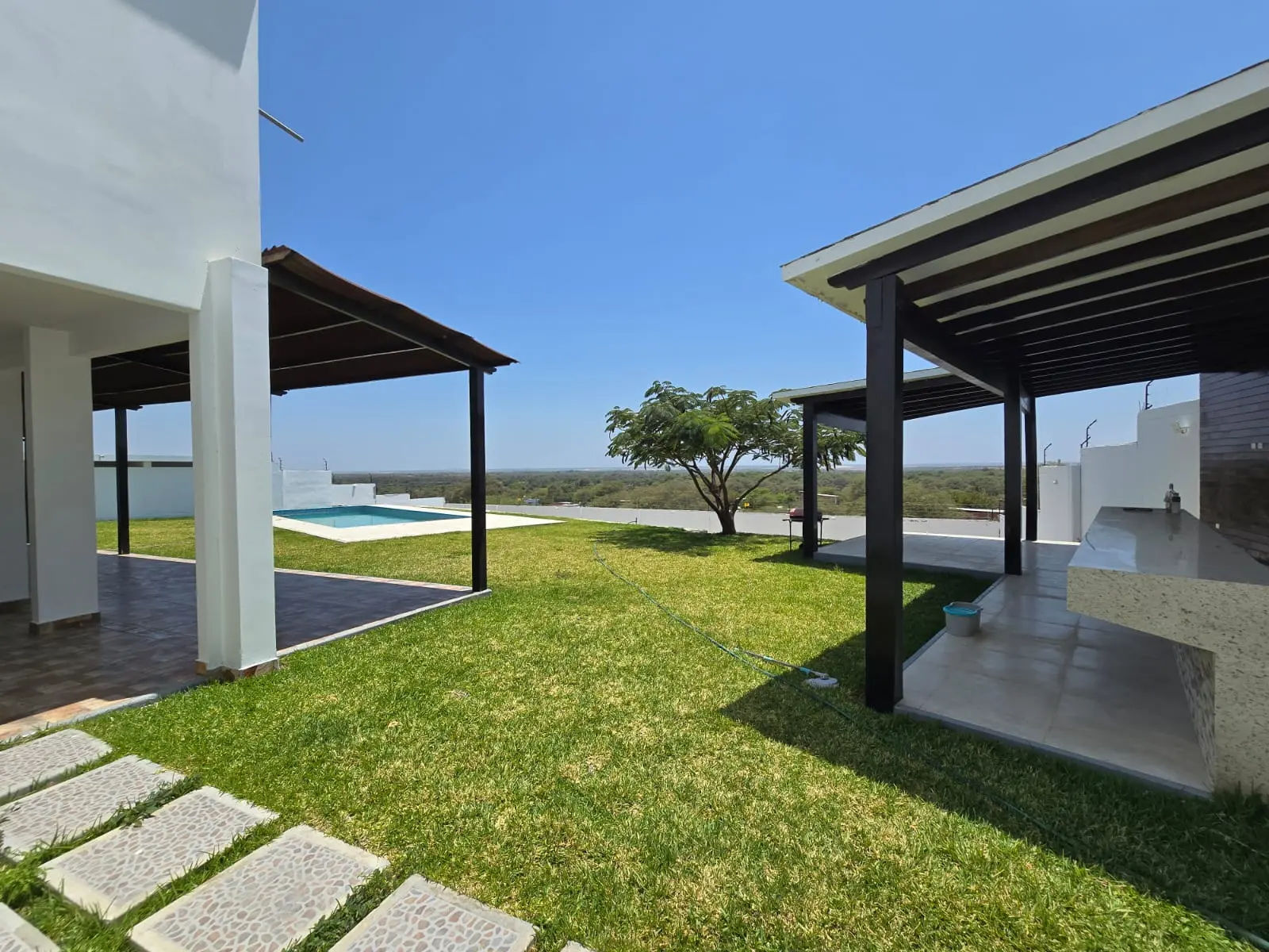 1er nivel: Cochera para tres camionetas, área de jardín, piscina grande con vista al valle, sala súper grande, comedor, cocina con reposteros altos y bajos, almacén, oficina o habitación, un medio baño de visita, área de terraza social con parrilla