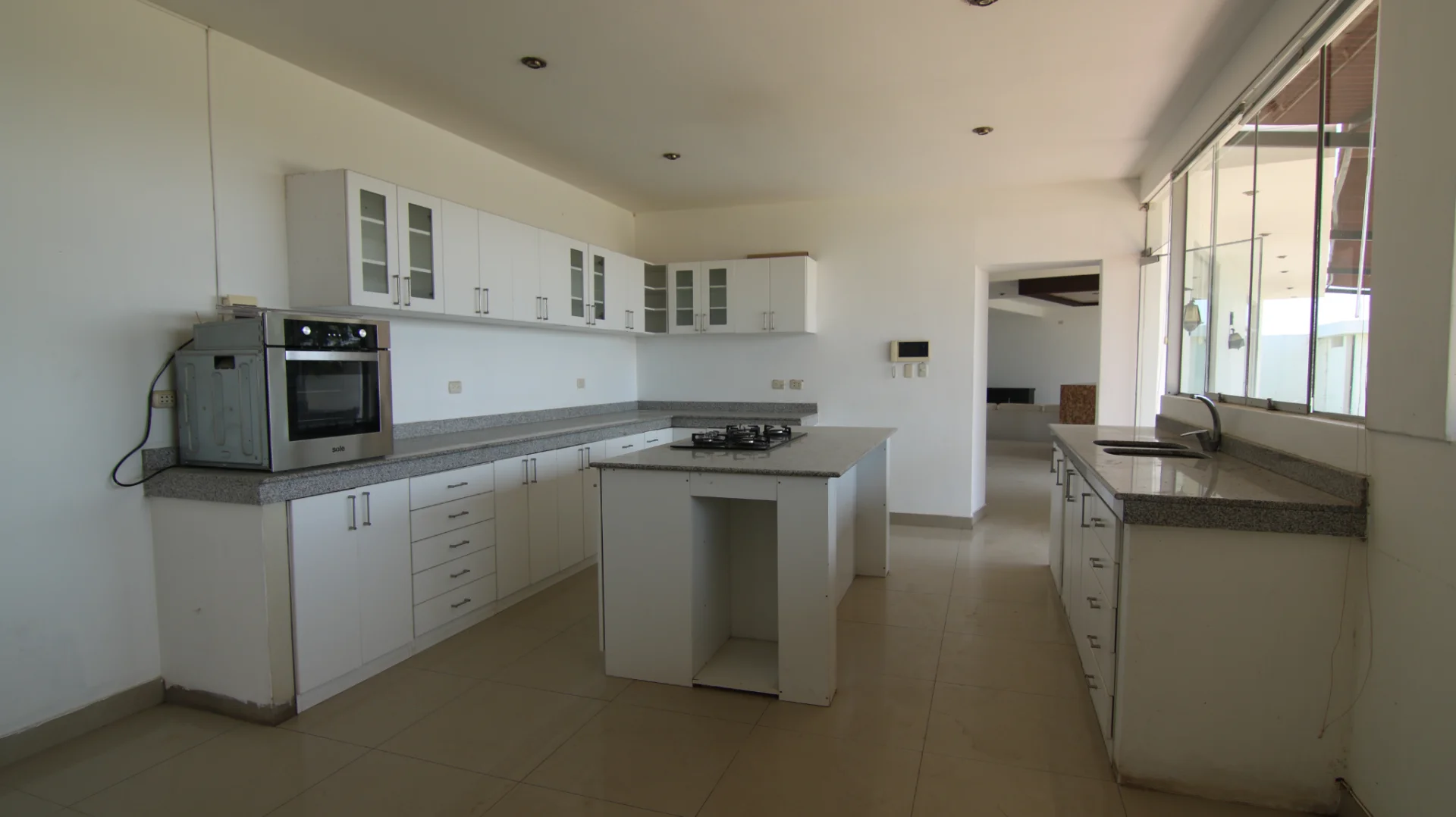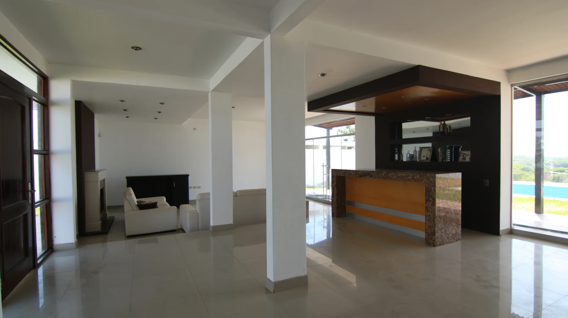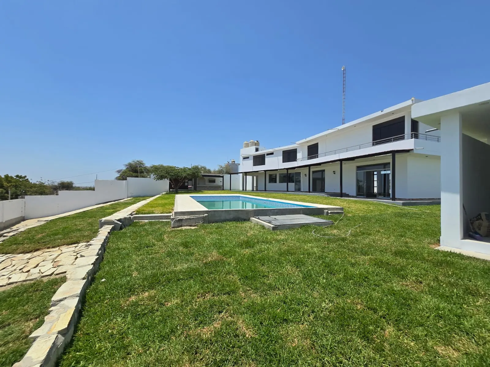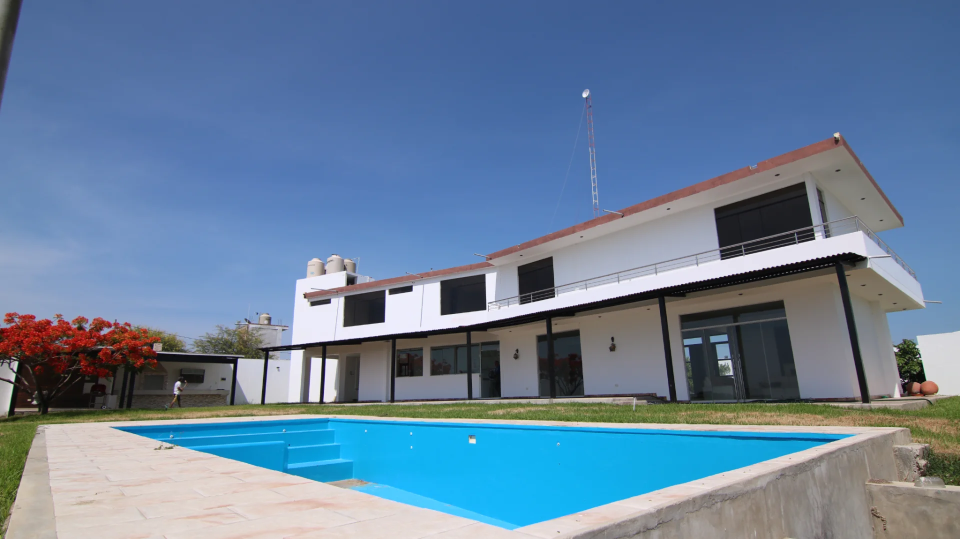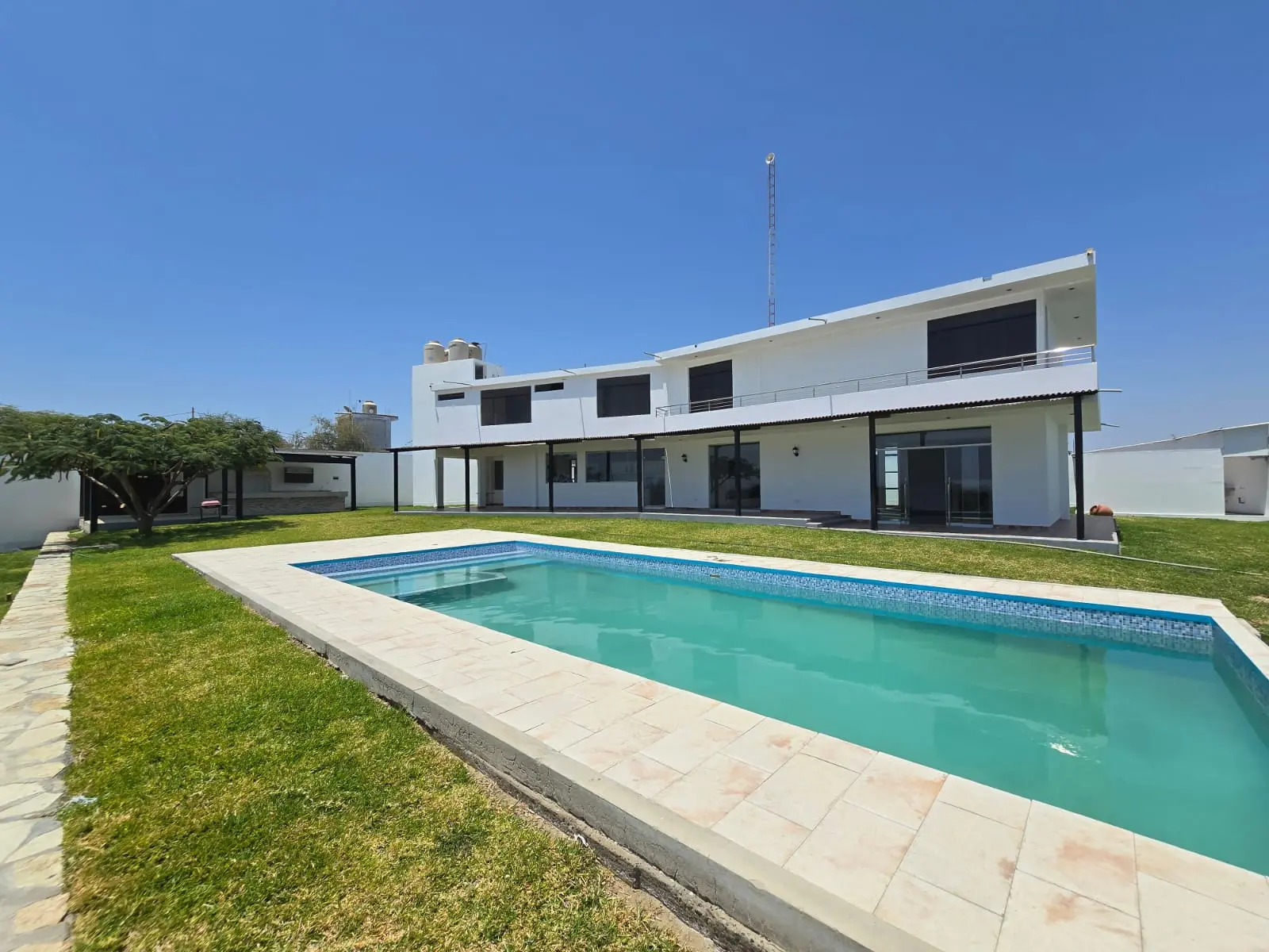 1er nivel: Cochera para tres camionetas, área de jardín, piscina grande con vista al valle, sala súper grande, comedor, cocina con reposteros altos y bajos, almacén, oficina o habitación, un medio baño de visita, área de terraza social con parrilla