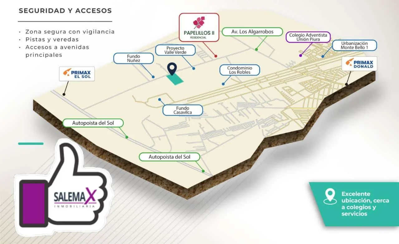 El inmueble se ubica muy cerca de la pista de la prolongación José Aguilar Santi Esteban, colindantes a proyectos inmobiliarios :Mar Verde ,Proyecto Valle VERDE ,Papelillo, Condominio los Robles ,entre otros, se encuentra ubicado en la, Piura.