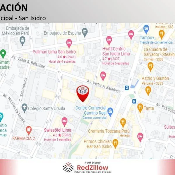 TIPO Oficina de m en casco en el piso del edificio Real ubicado en la zona empresarial del distrito de San IsidroUBICACIN Av Camino Real en el distrito de San Isidro en zona empresarial y comercial CARACTERSTICAS DE EDIFICIO Sala de Usos Mltiples Sala de Proveedores Aire Acondicionado Grupo Elctrgeno CONTACTAR Celular WhatsApp Somos RedZillow especialistas en servicios corporativos abarcando desde la representacin de propietarios y arrendatarios hasta el financiamiento de capital a largo plazo Nuestra meta es ayudarte a fortalecer y enriquecer la inversin en tu negocio ocupndonos de soportar tus decisiones inmobiliarias sobre espacios de oficinas almacenes retail terrenos y plantas industriales Somos RedZillow especialistas en servicios corporativos inmobiliarios con alto compromiso y experiencia en la representacin de propietarios compradores y arrendatarios Nuestra meta es ayudarte a encontrar el mejor espacio para negocio o actividad comercial ocupndonos de soportar tus decisiones inmobiliarias relacionadas a espacios de almacenes plantas industriales locales comerciales oficinas y terrenos