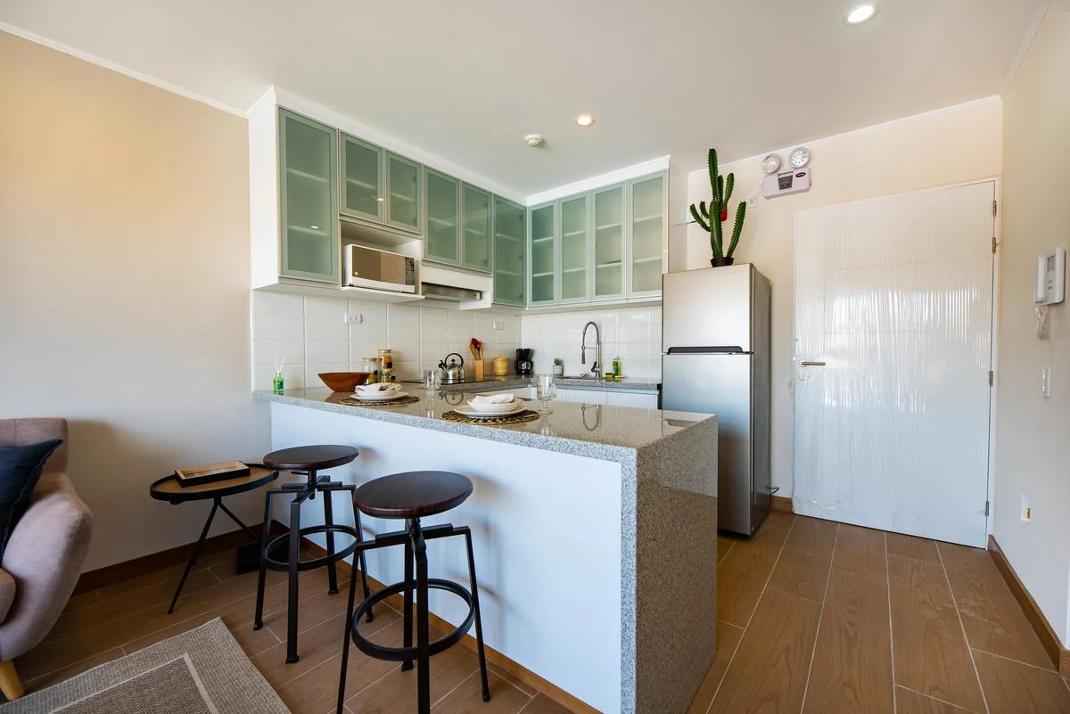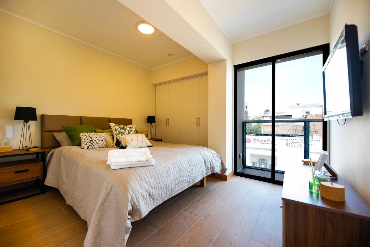Edificio de 7 pisos, línea blanca, 1 año de antigüedad, vista a la calle, impecable, piso 4, guardianía, flat. Hall de ingreso, sala, comedor, living-comedor, kitchenette, 2 dormitorios, 2.0 baños, 1 baño incorporado, lavandería. Cochera tipo paralelas en sotano, 1 ascensor, ascensor. Areas comunes, permite mascotas, area de bbq, areas verdes.