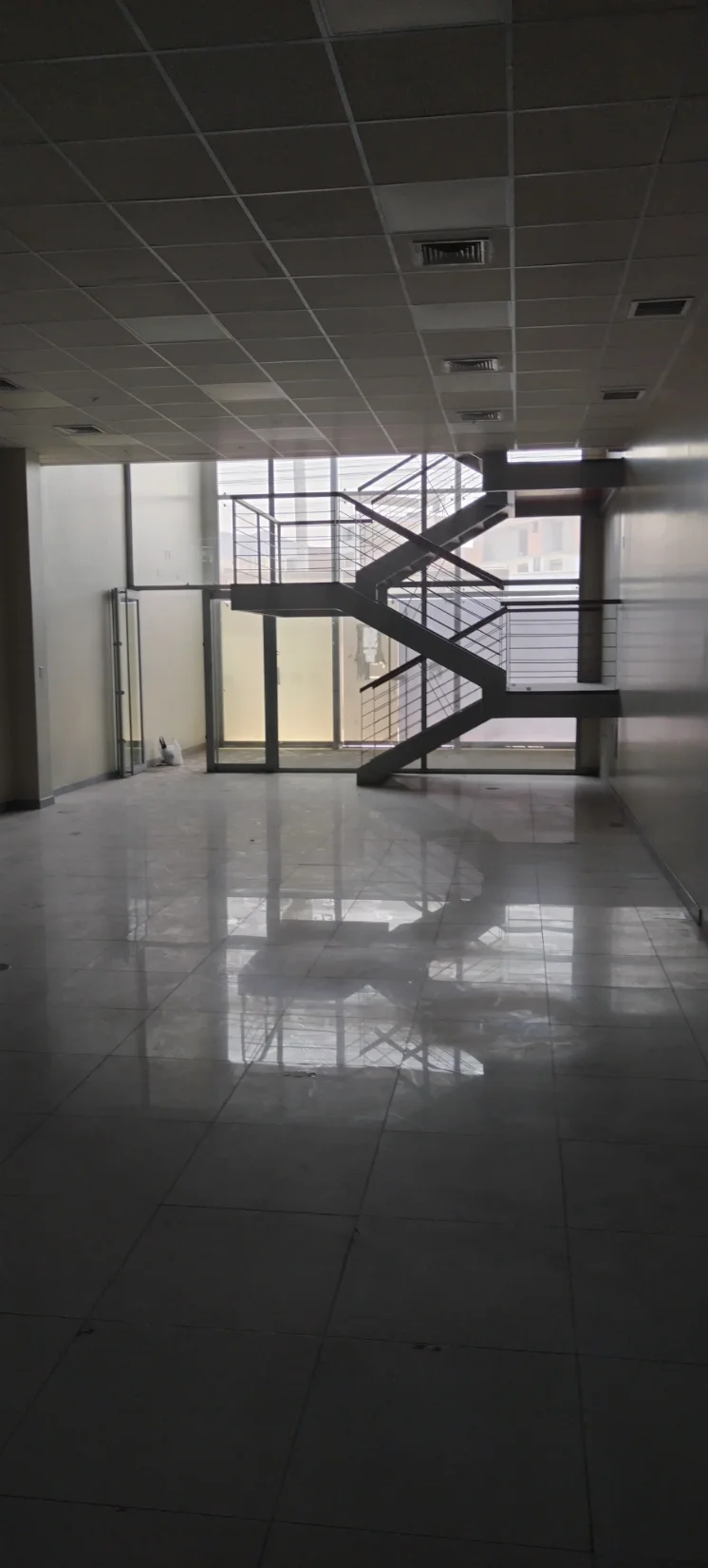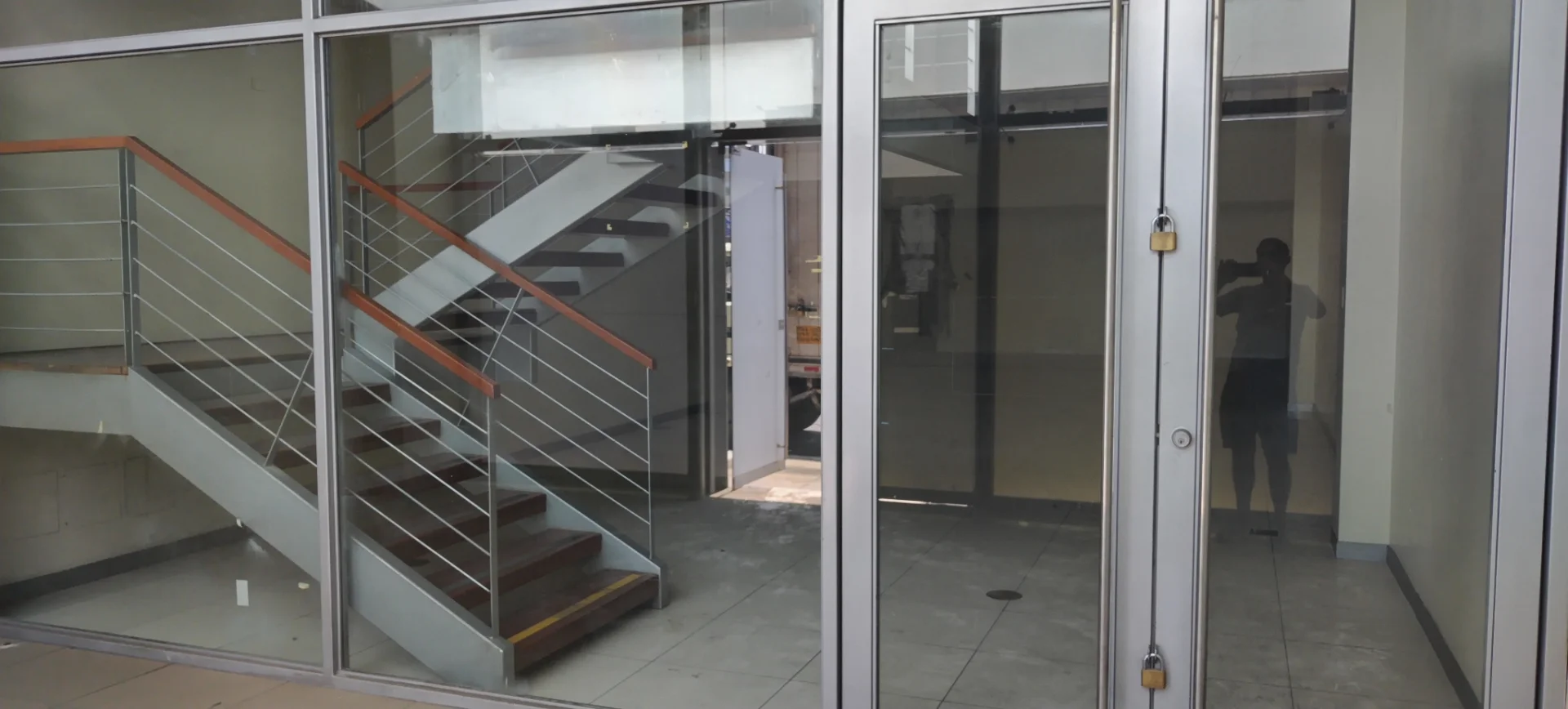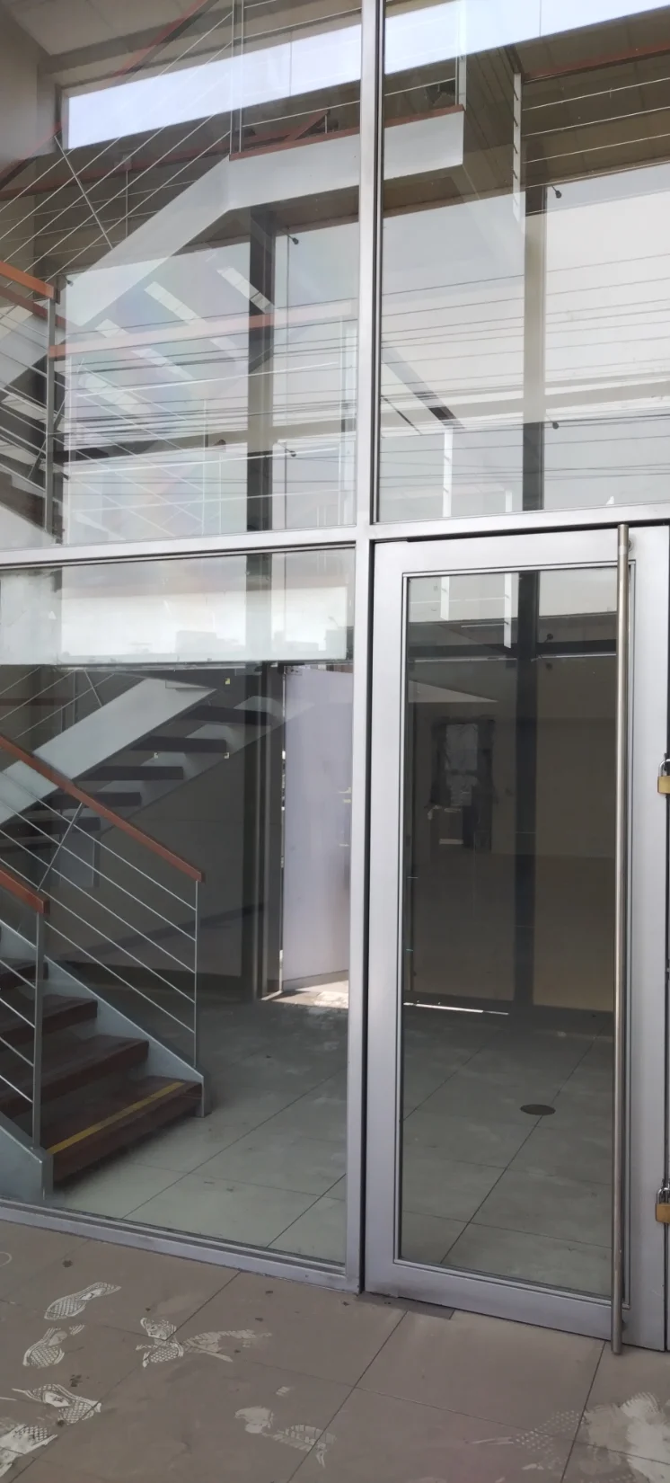 Distribucion: Area: 208.50m2, puertas de vidrio muy seguras con buenos acabados , pisos de mayólicas, escaleras de aluminio y madera, también tiene dos espacios que podrían ser área de oficinas, cajas, almacen o bóvedas, cisterna de agua