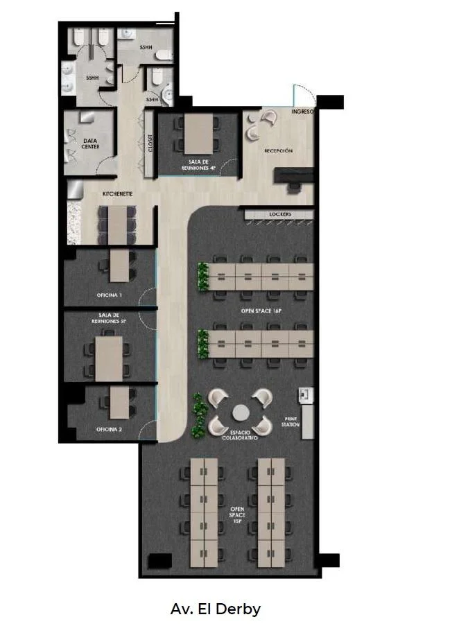 La oficina cuenta con una excelente distribución que incluye una recepción definida, kitchenette, directorio o sala de reuniones, 3 baños, un área amplia destinada a pool de oficinas, oficinas privadas para mayor confidencialidad, un espacio para data center y una zona de comedor para el personal.