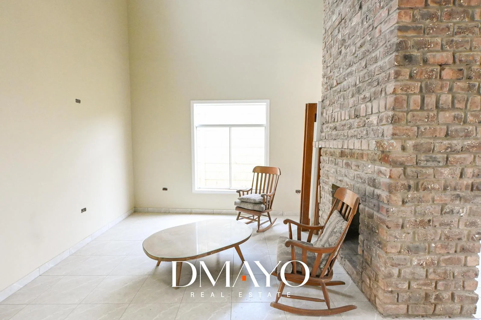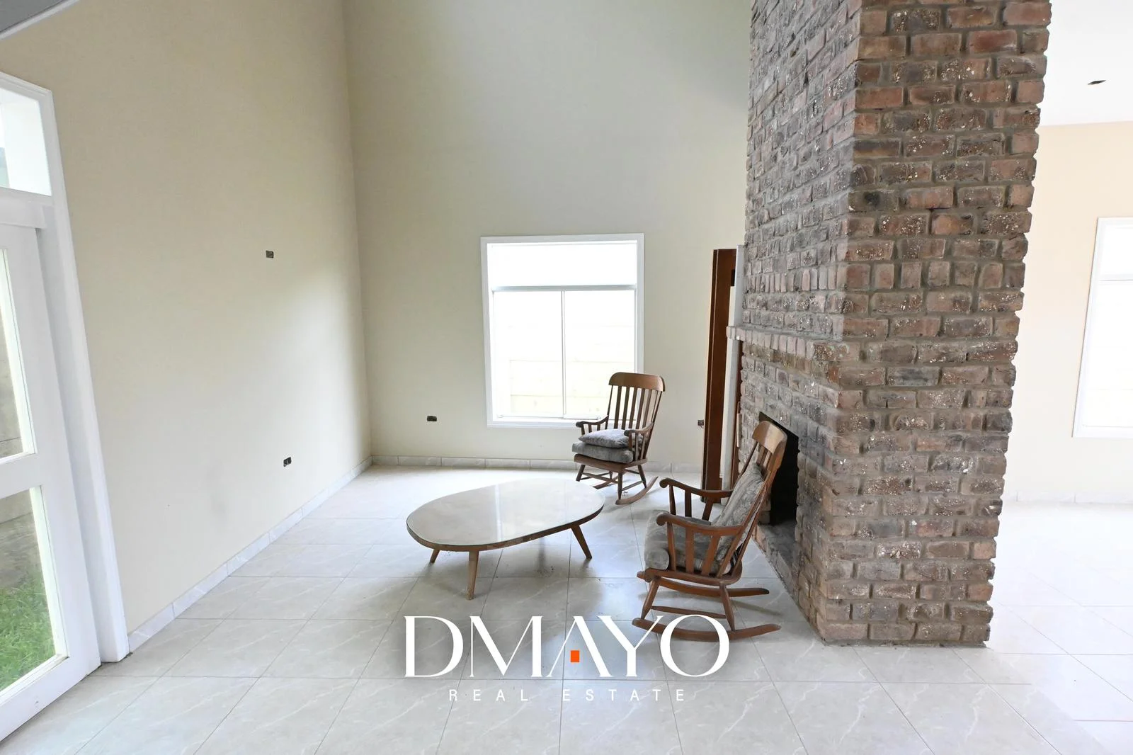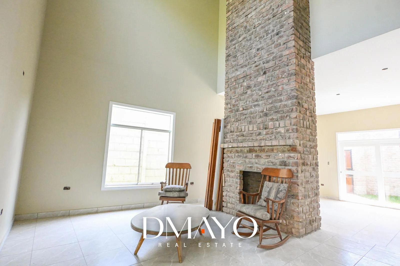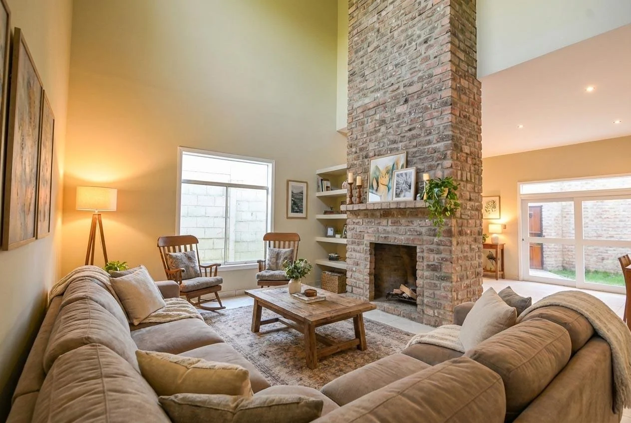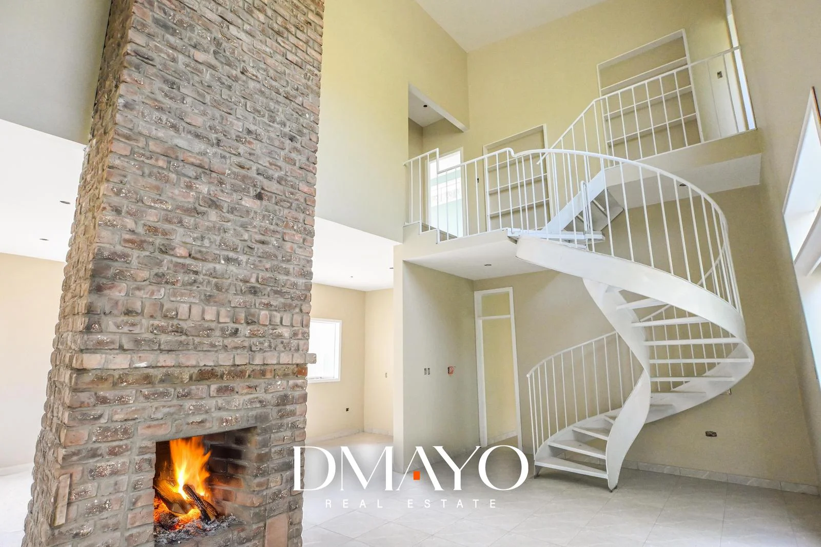Sala con chimenea / comedor y cocina abierta, baño completo y lavandería.