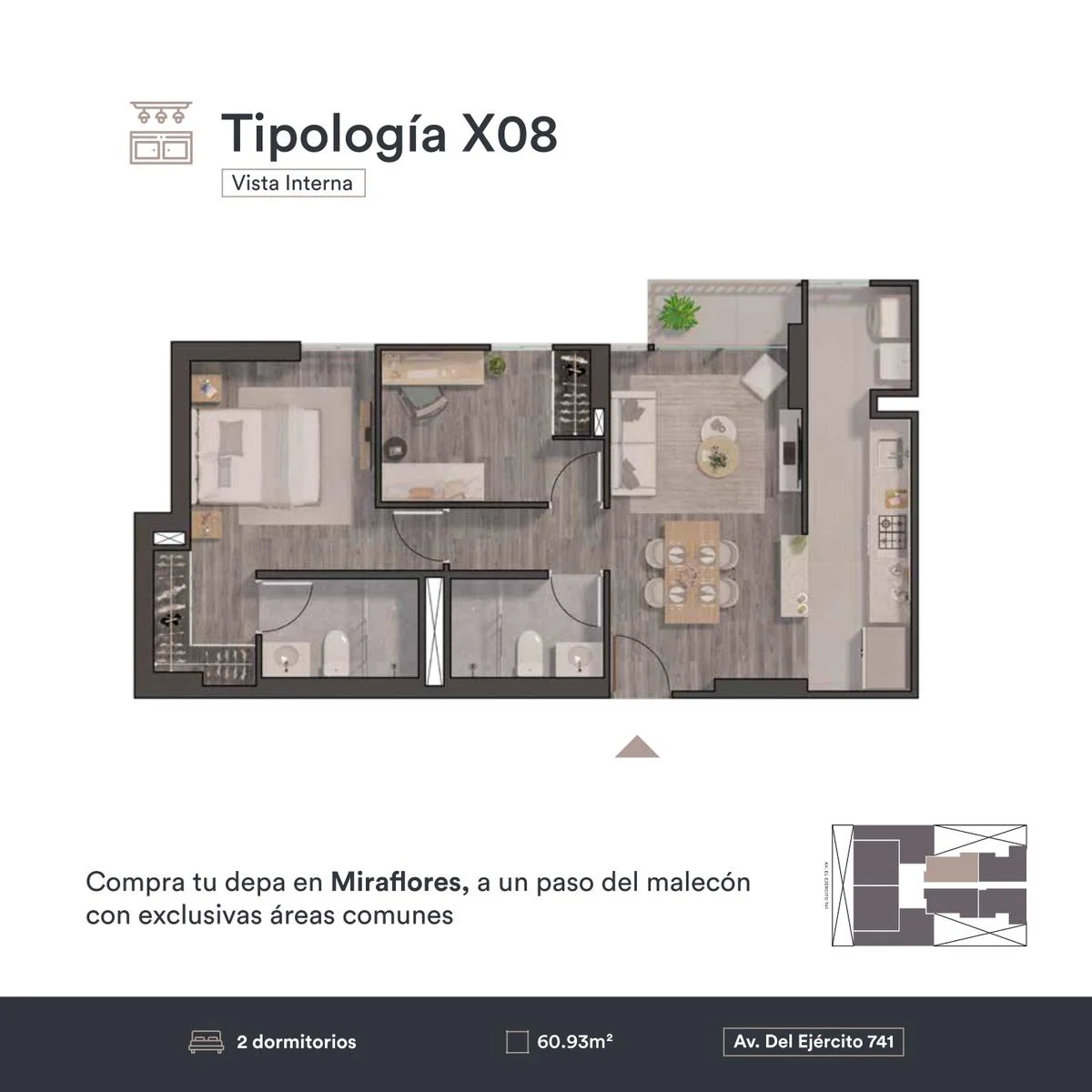 Tu departamento cuenta vista interna y externa, y un área de 60.93m2, distribuidos de la siguiente manera:
