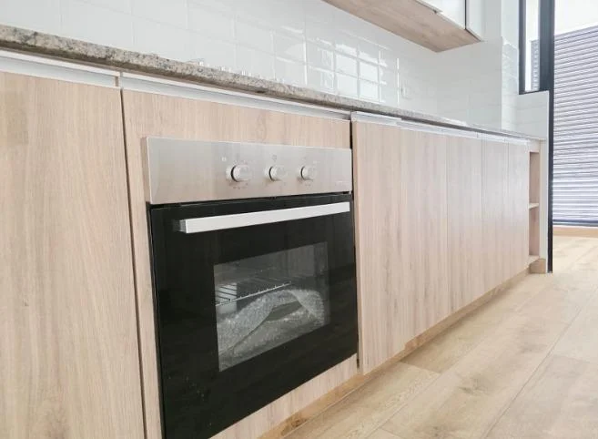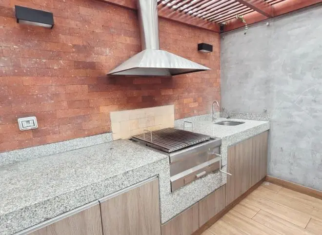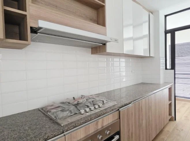 Cocina cerrada con finos acabados, muebles altos y bajos, equipada con encimera, horno y campana