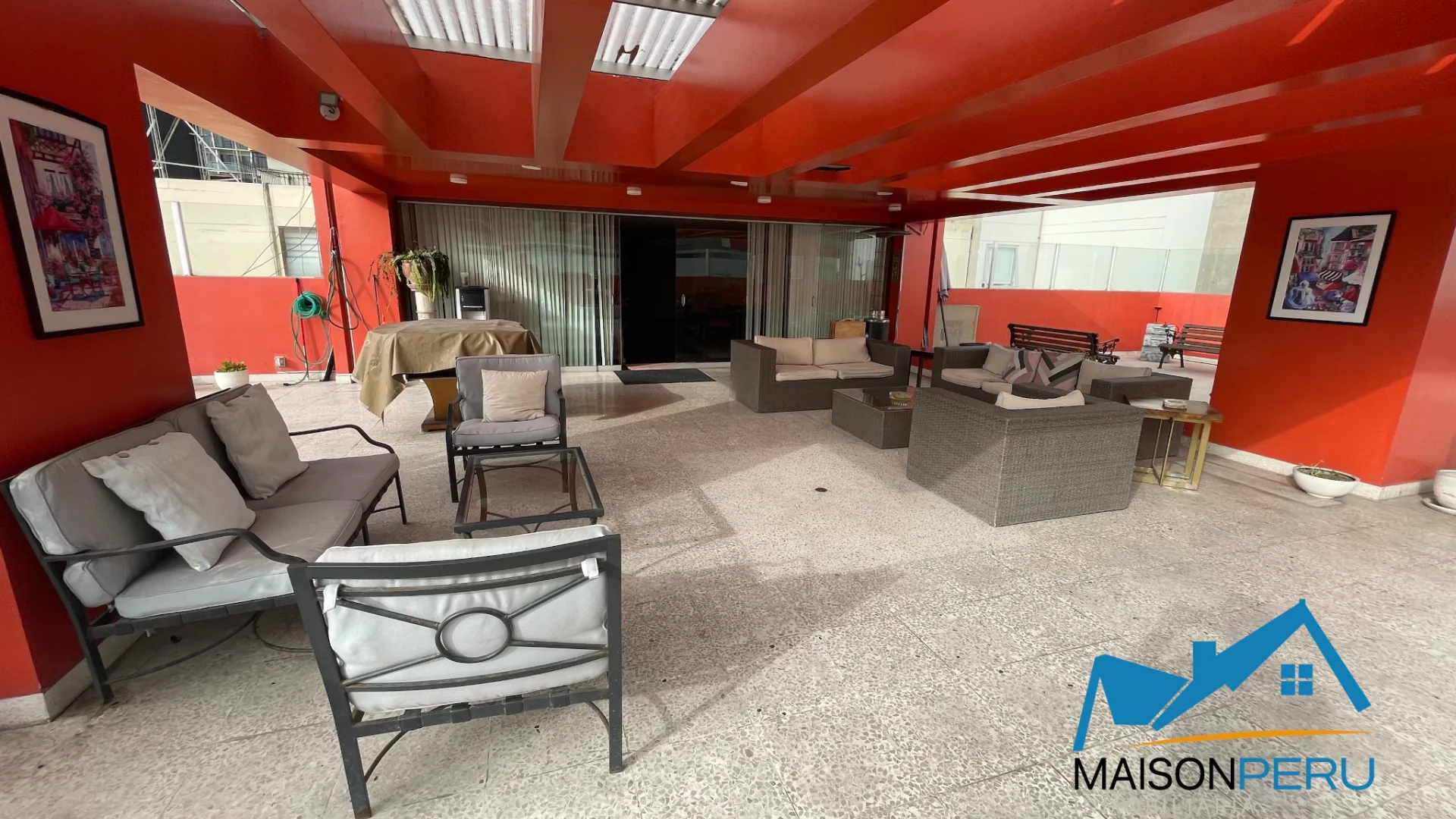 Amplia terraza social con zona de parrilla y área de juegos con billar.